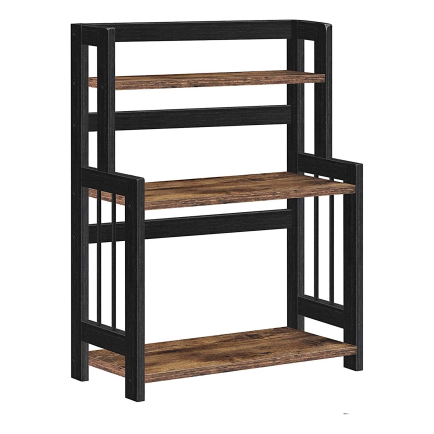 • Het opbergrek met rustieke bruine planken en een zwart frame geeft uw keuken zeker een vleugje charme.