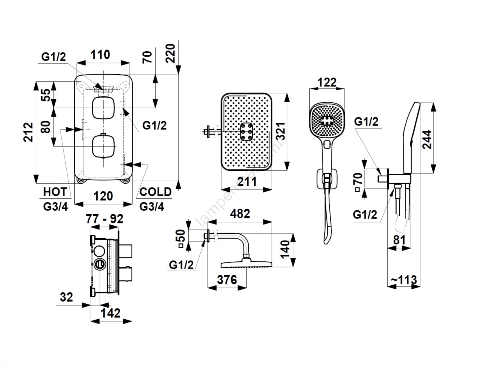 • Verpakking bevat: inbouwdoos, complete kraan, douchearm, douchekop met slang, inbouw wandhoek-aansluiting.