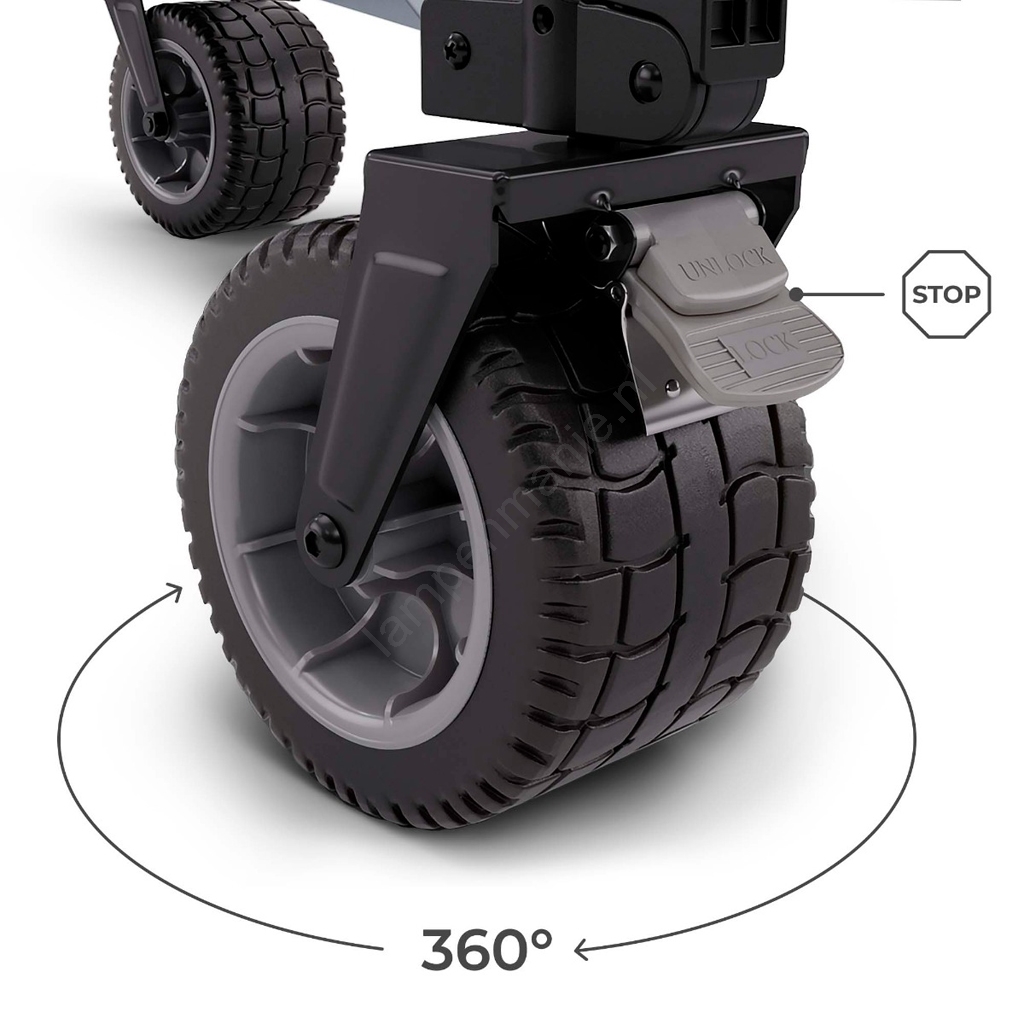• De grote terrein-PVC-wielen van 10 cm breed zijn geschikt voor zand, gras en grind, waardoor de kar ook op oneffen terrein stabiel blijft.