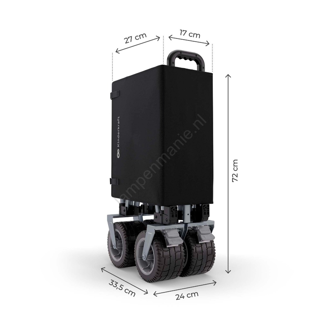 • Opgevouwen heeft de kar compacte afmetingen 33,5 x 24 x 72 cm, zodat hij gemakkelijk in zelfs een kleinere kofferbak past.