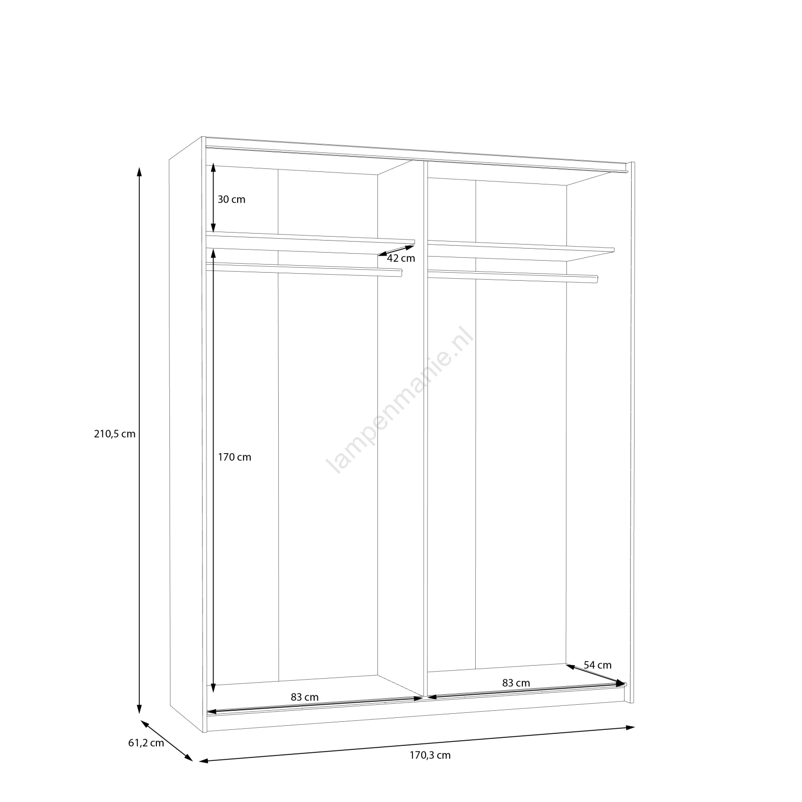 • De kast is uitgerust met kledingstangen, planken en ruime opbergruimte voor uw kleding, tassen en seizoensartikelen.