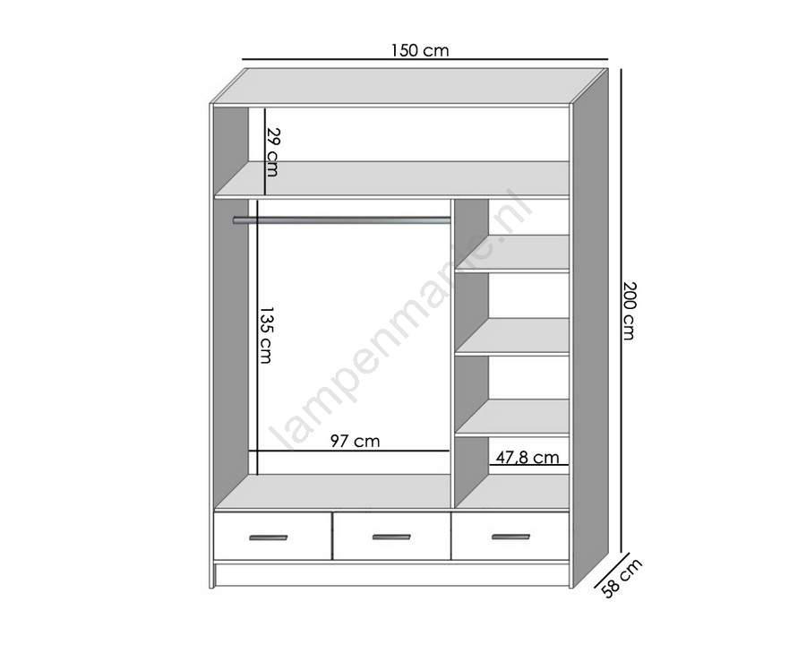 • De kast beschikt over 4 open planken, 3 lades, een kledingroede en een bovenplank voor het opbergen van tassen en seizoensgebonden items.