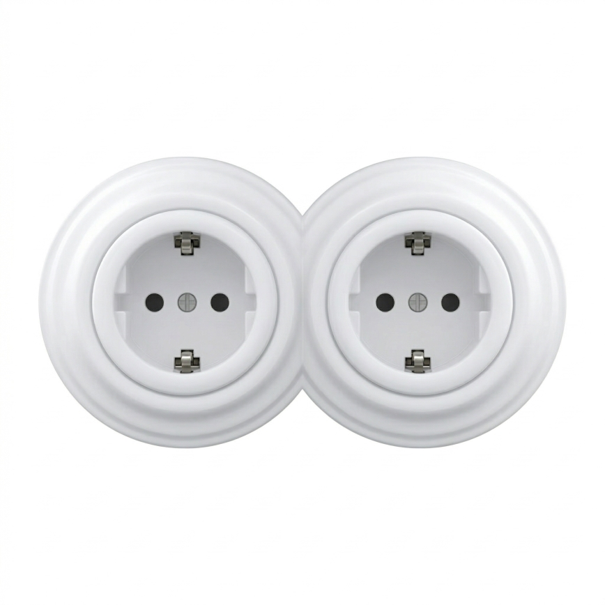 • Kliklap - Dubbele retro-wandcontactdoos met afdekraam SCHUKO 230V/16A, wit keramiek