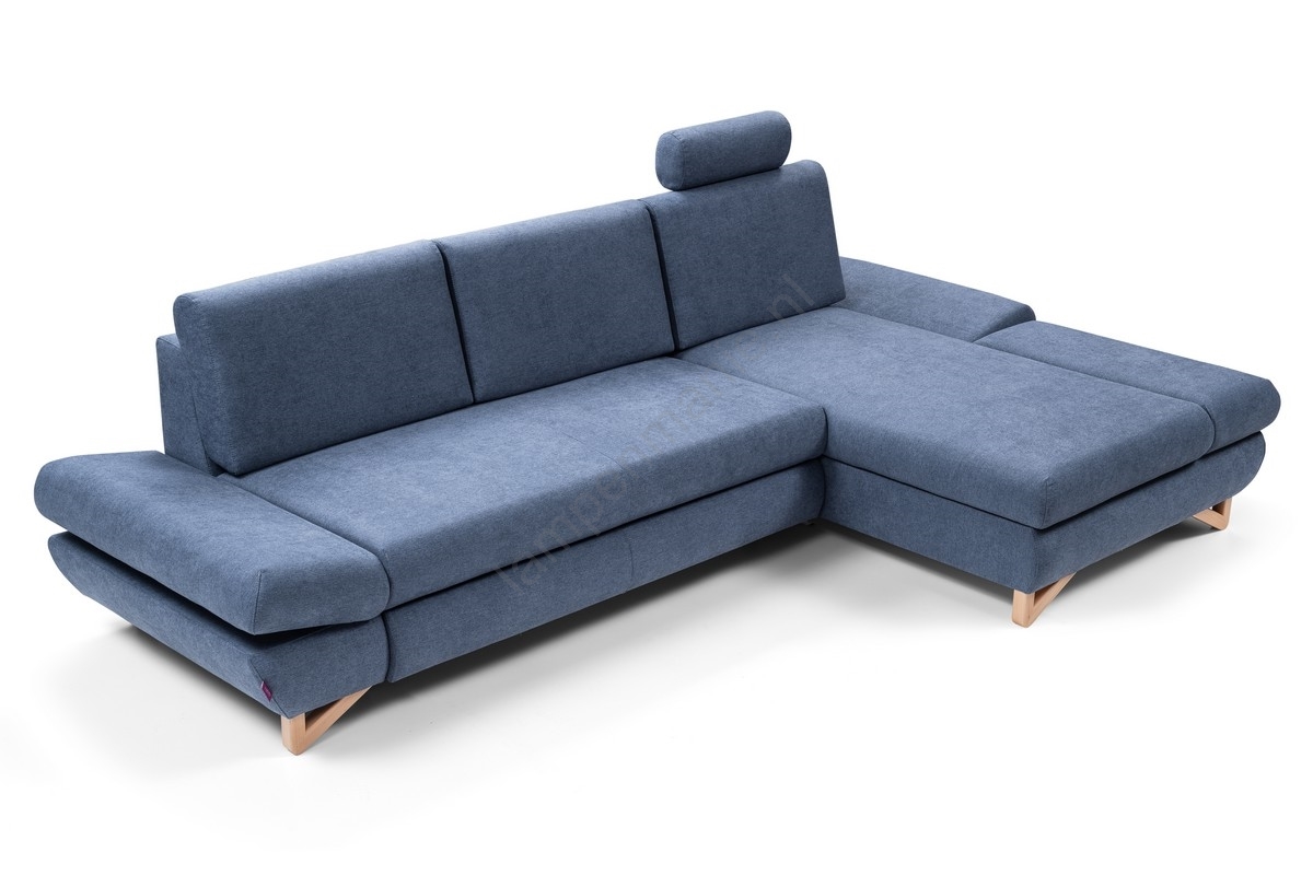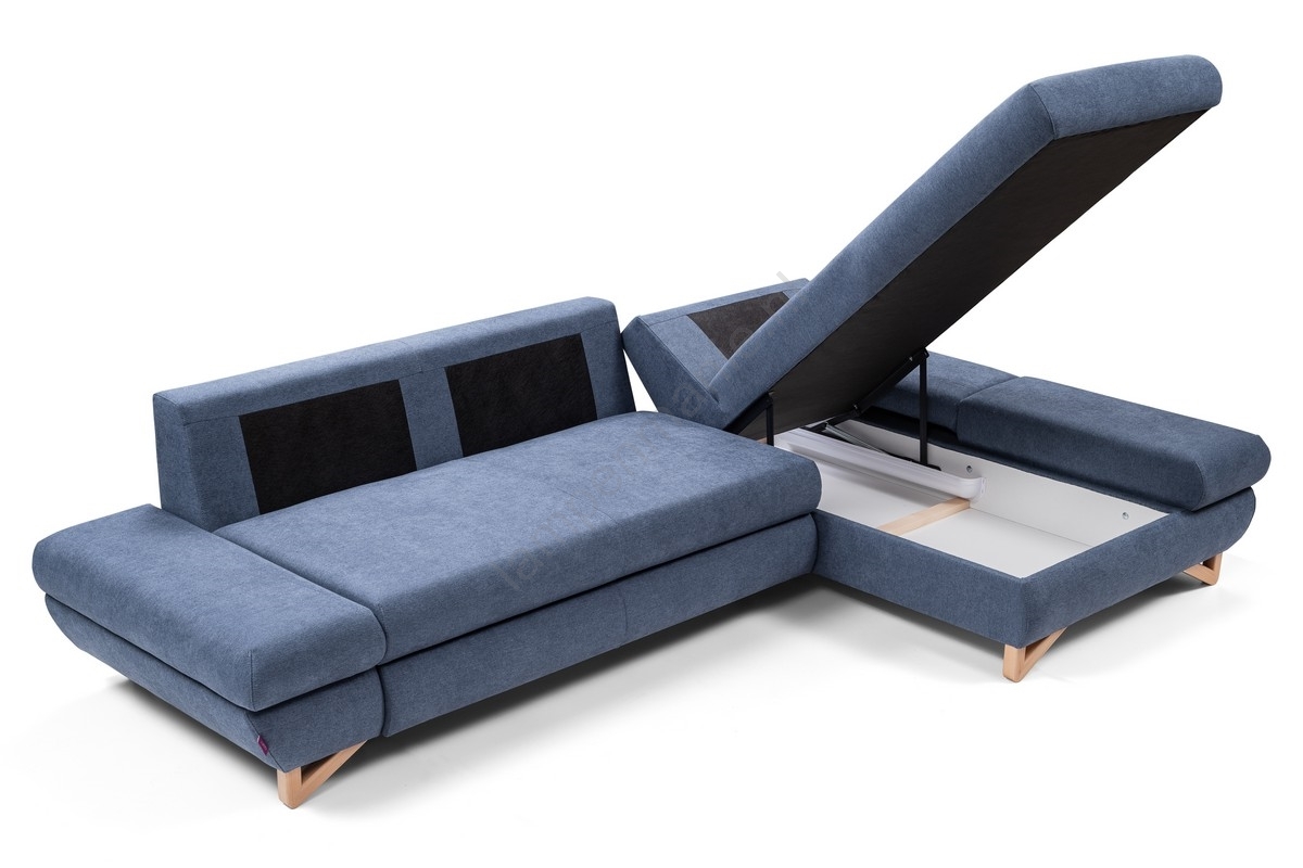 Uitklapbare gestoffeerde hoekbank AVESTA, L-vormig, met opbergruimte, rechts, blauw