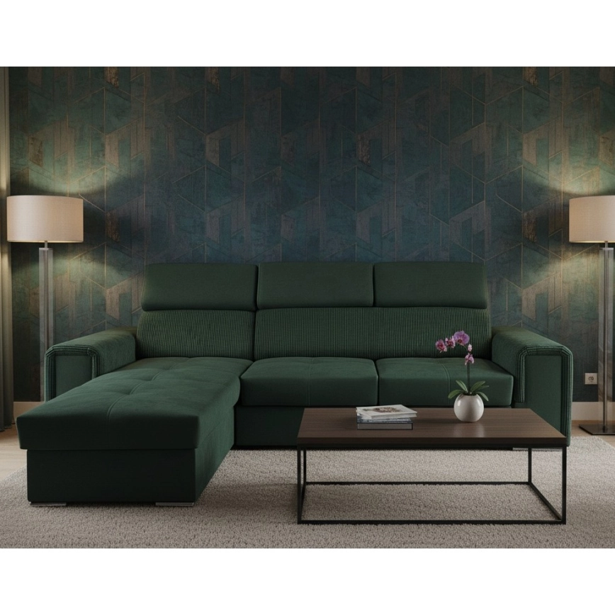 Universele L-vormige hoekbank SALVADA met slaapfunctie en opbergruimte, groen