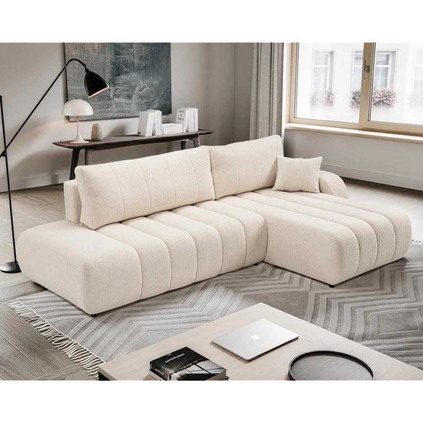 • Uitklapbare L-vormige hoekbank DESIO, rechts, beige, met opbergruimte