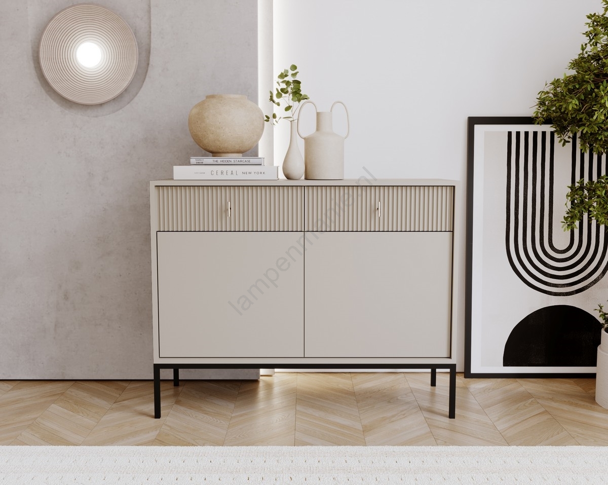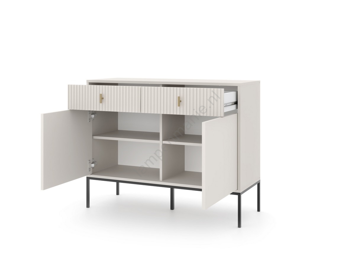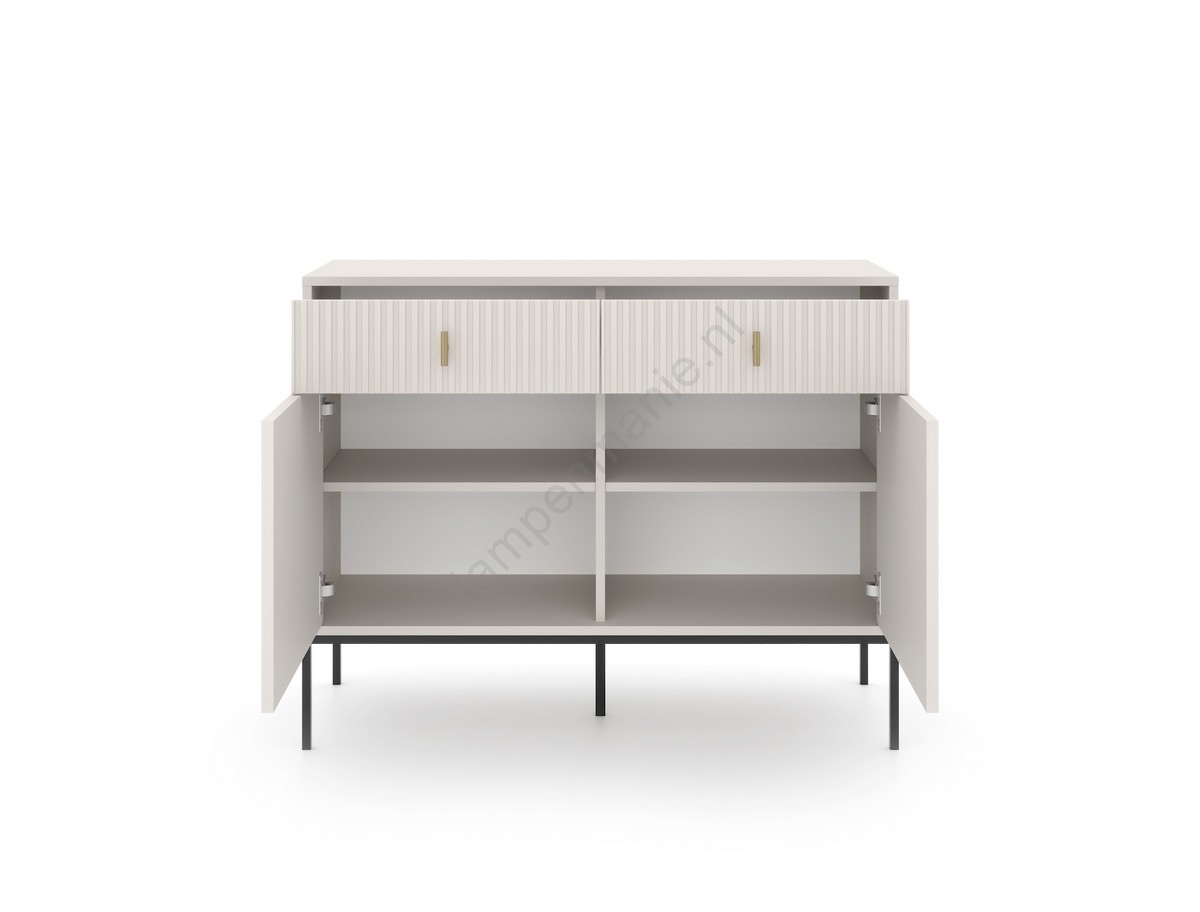 • Voorzien van twee onderste deuren met veel bergruimte en twee lades met handgrepen en verticale groeven.