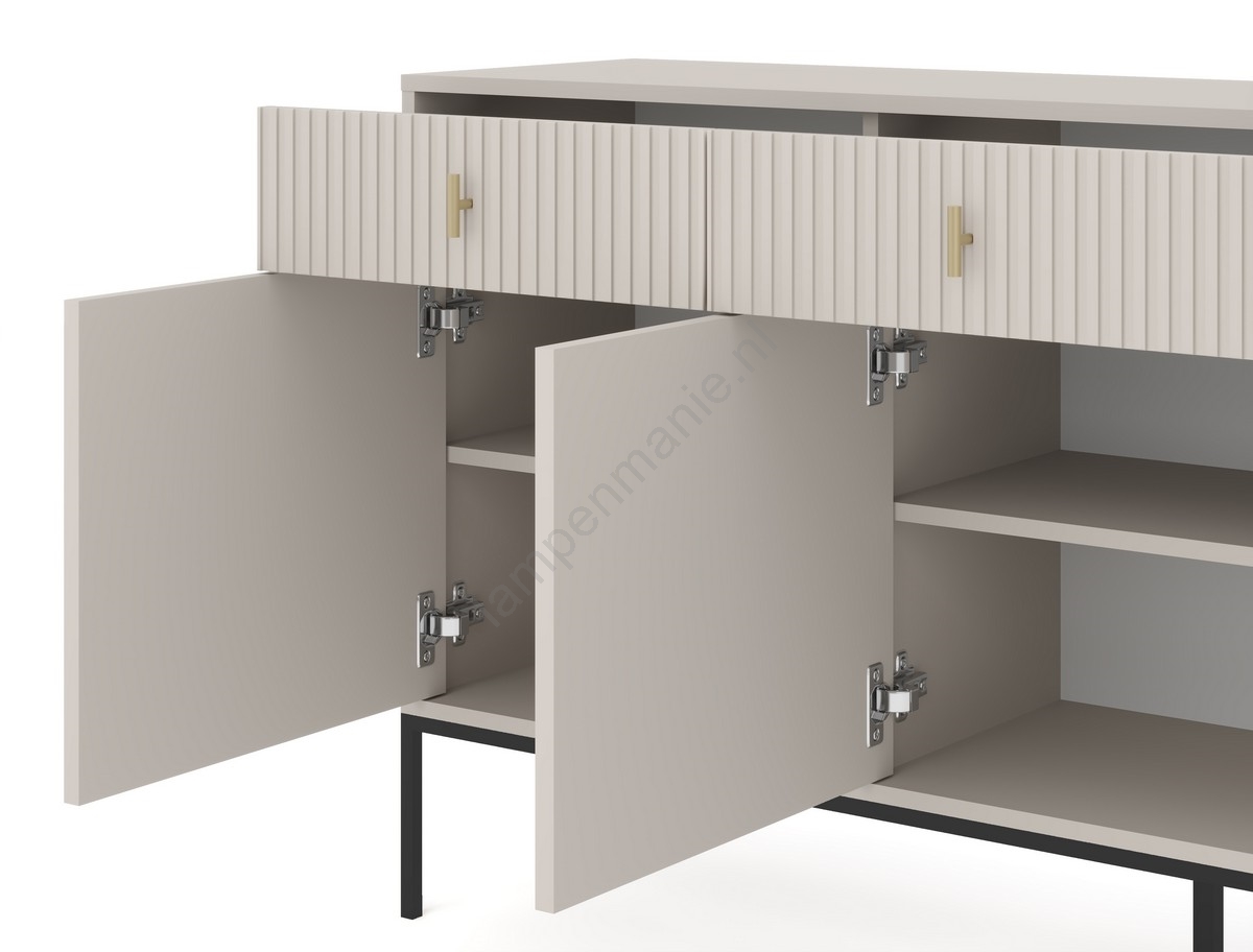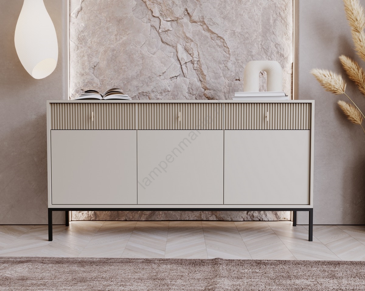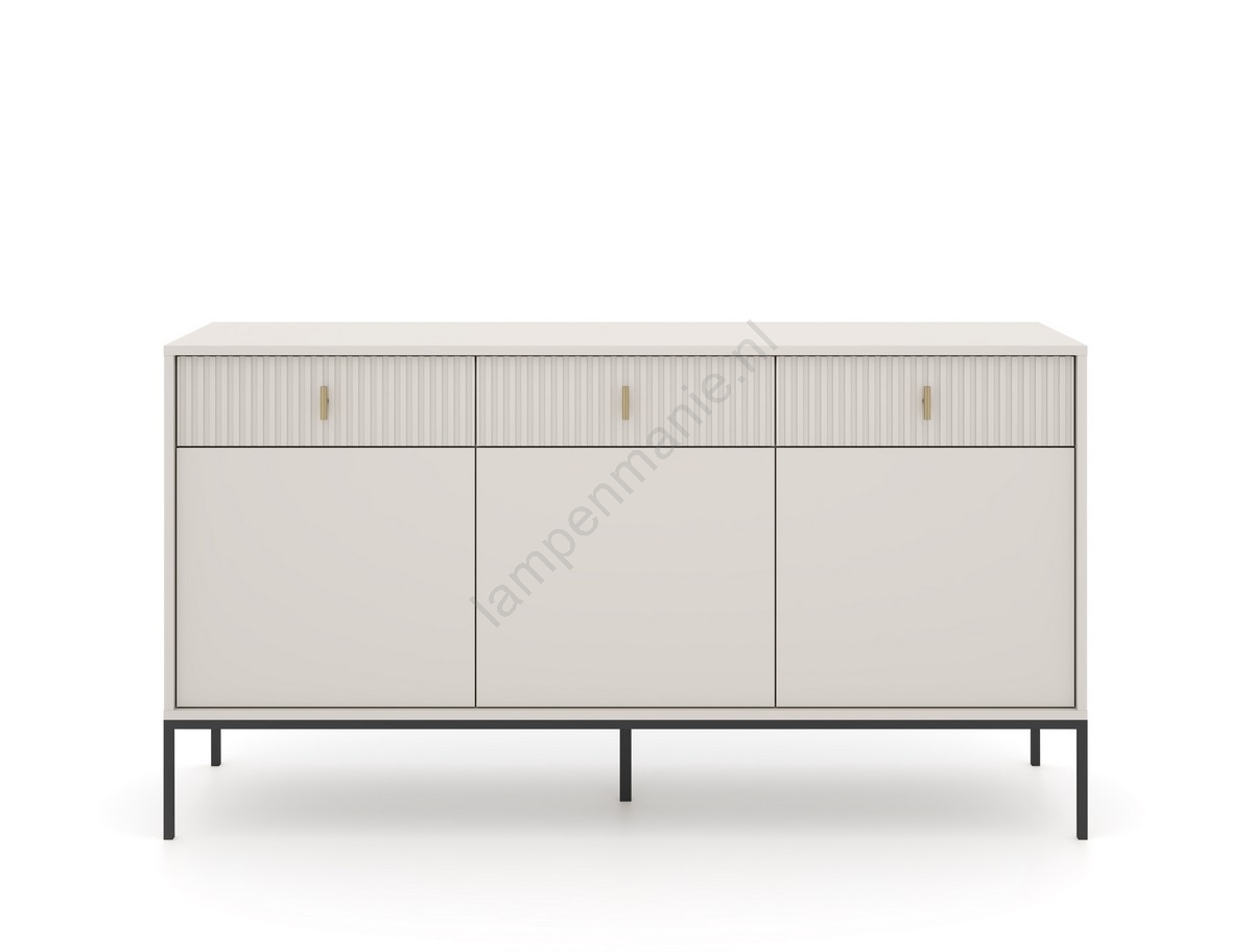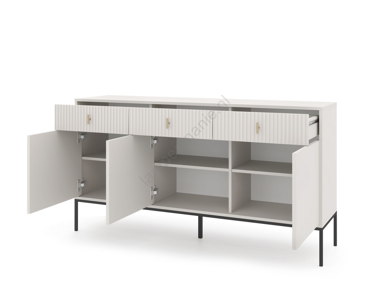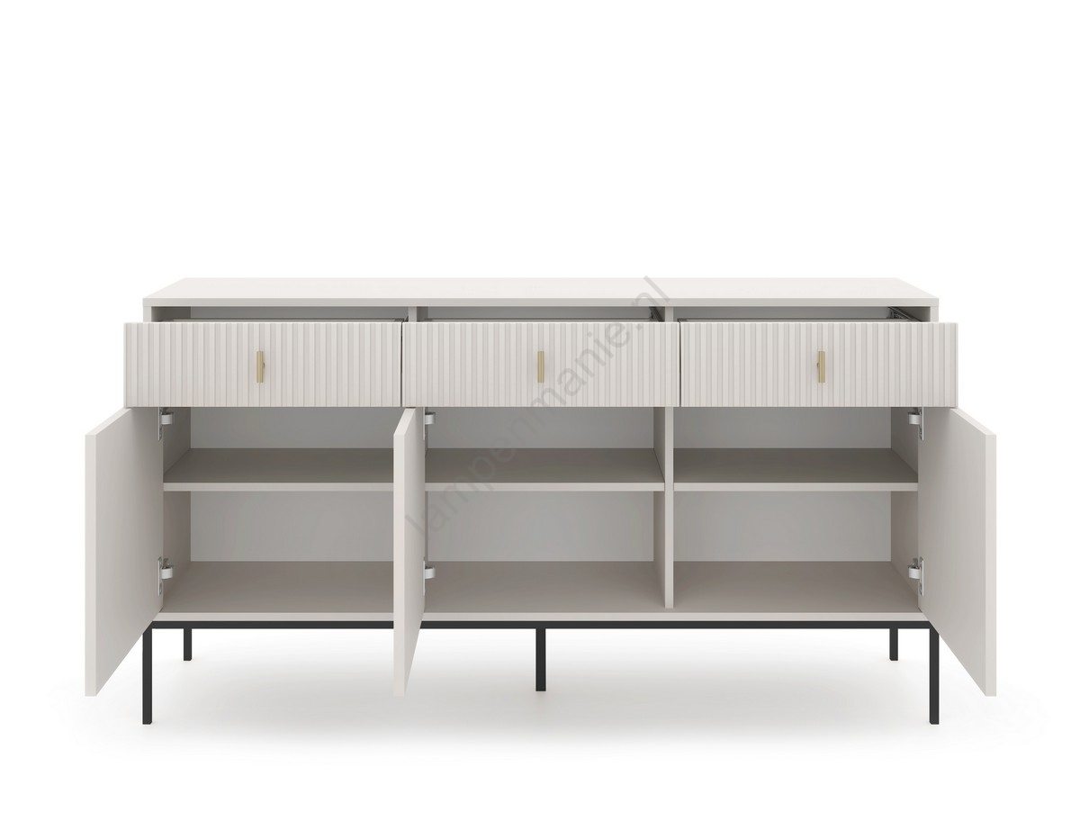 • Voorzien van drie onderdeuren met royaal opberggedeelte en drie laden met handgrepen en verticale ribstructuur.
