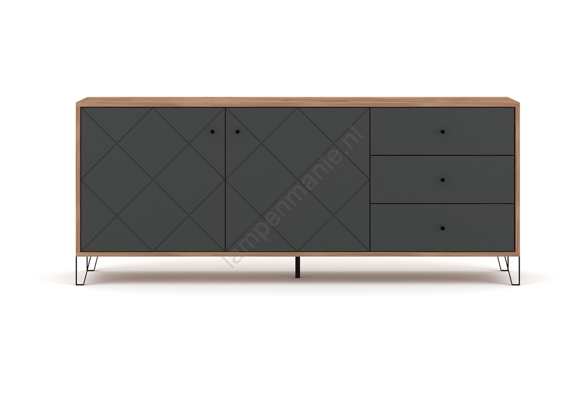• Het heeft twee deuren aan de linkerkant en drie lades aan de rechterkant, voor overzichtelijke opbergruimte.