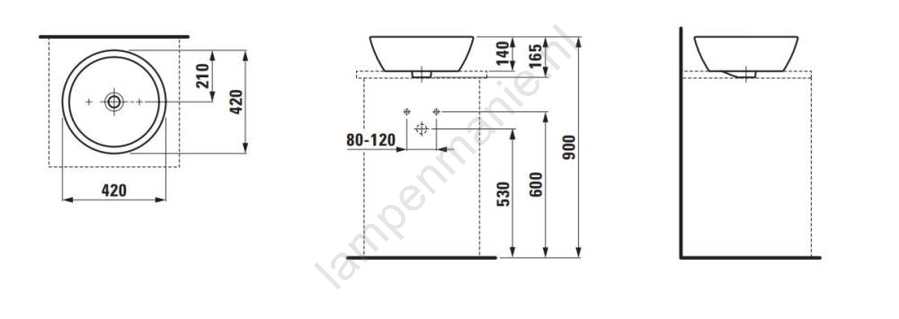 • De wastafel is bedoeld voor plaatsing op een blad, wat flexibele plaatsing en combinatie met verschillende soorten badkamerbladen mogelijk maakt.