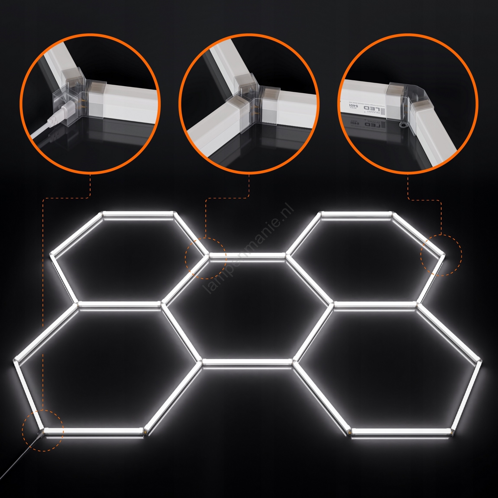 • Dankzij de zeshoekige structuur functioneert de verlichting zowel als esthetisch element als functioneel verlichtingssysteem.