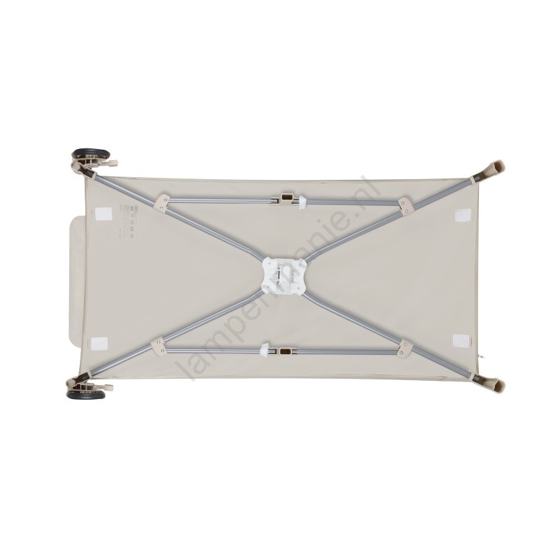 • Inbegrepen: verschoontafel met zijvakken (voor luiers, poeder, enz.), mandje met twee vakken voor accessoires, grote muskietennet, kap en speelboog met pluche speelgoed.