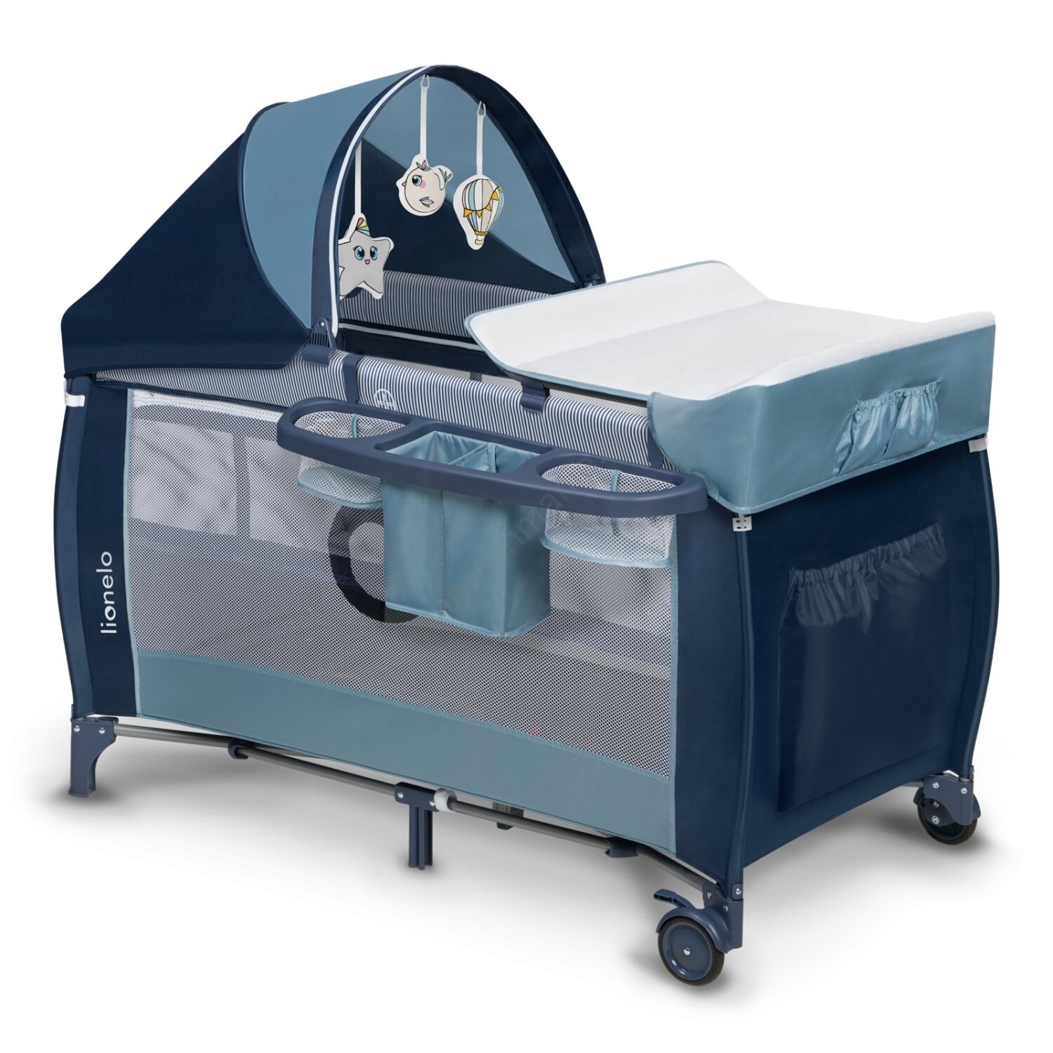 • Wordt geleverd met: verschoontafel met zijvakken (voor luiers, poeder etc.), een accessoiremand met twee vakken, een grote klamboe, een luifel en een speelboog met pluche speeltjes.