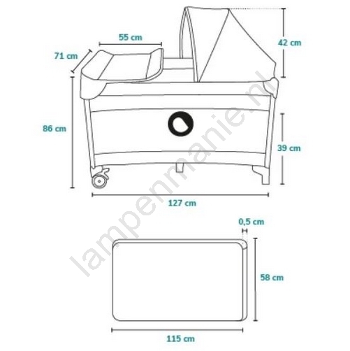 • Inclusief opvouwbare reismatras die ook in het inzetbedje gebruikt kan worden (afmeting 120x60 cm), het inzetbedje is ook inbegrepen.