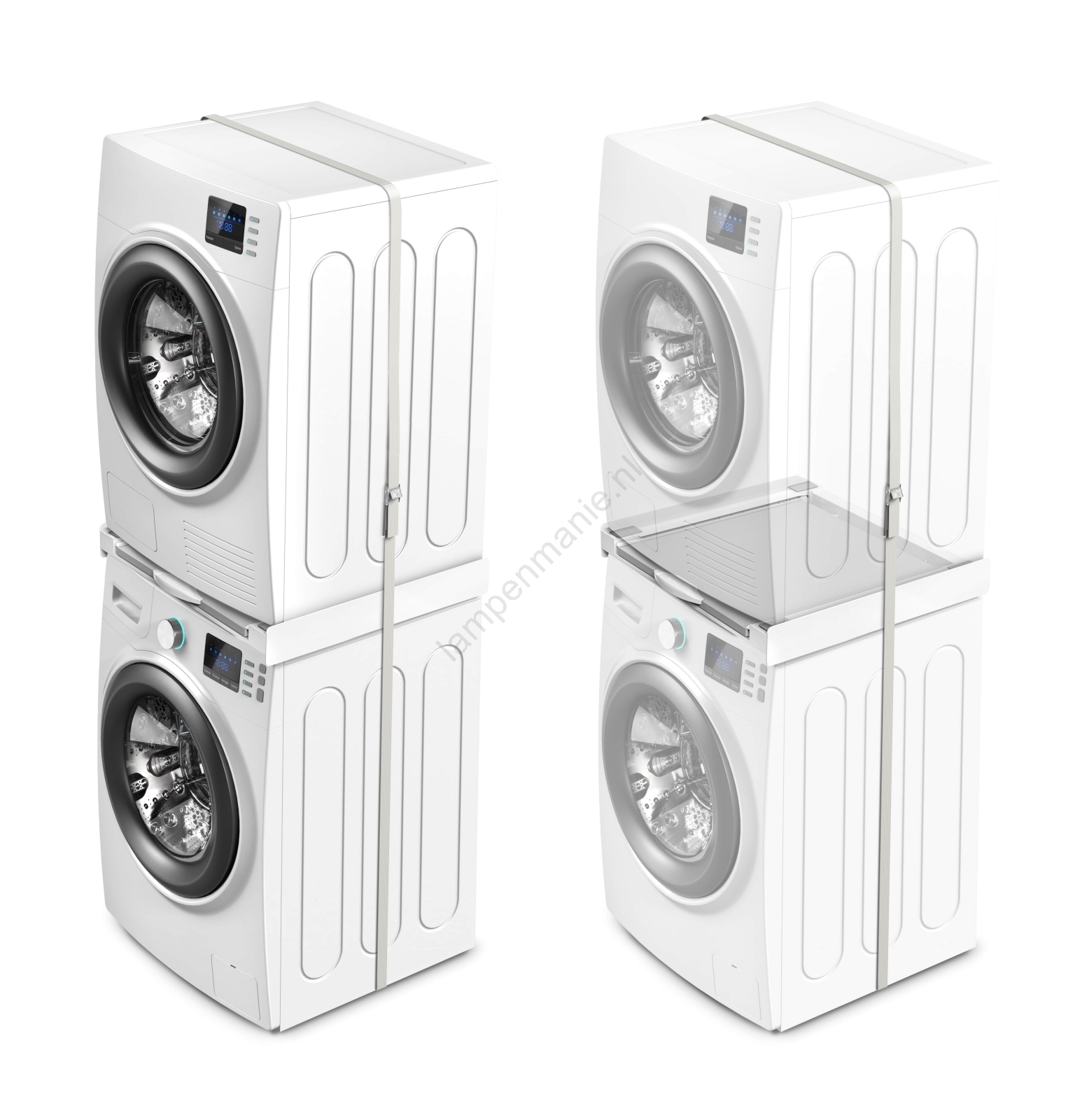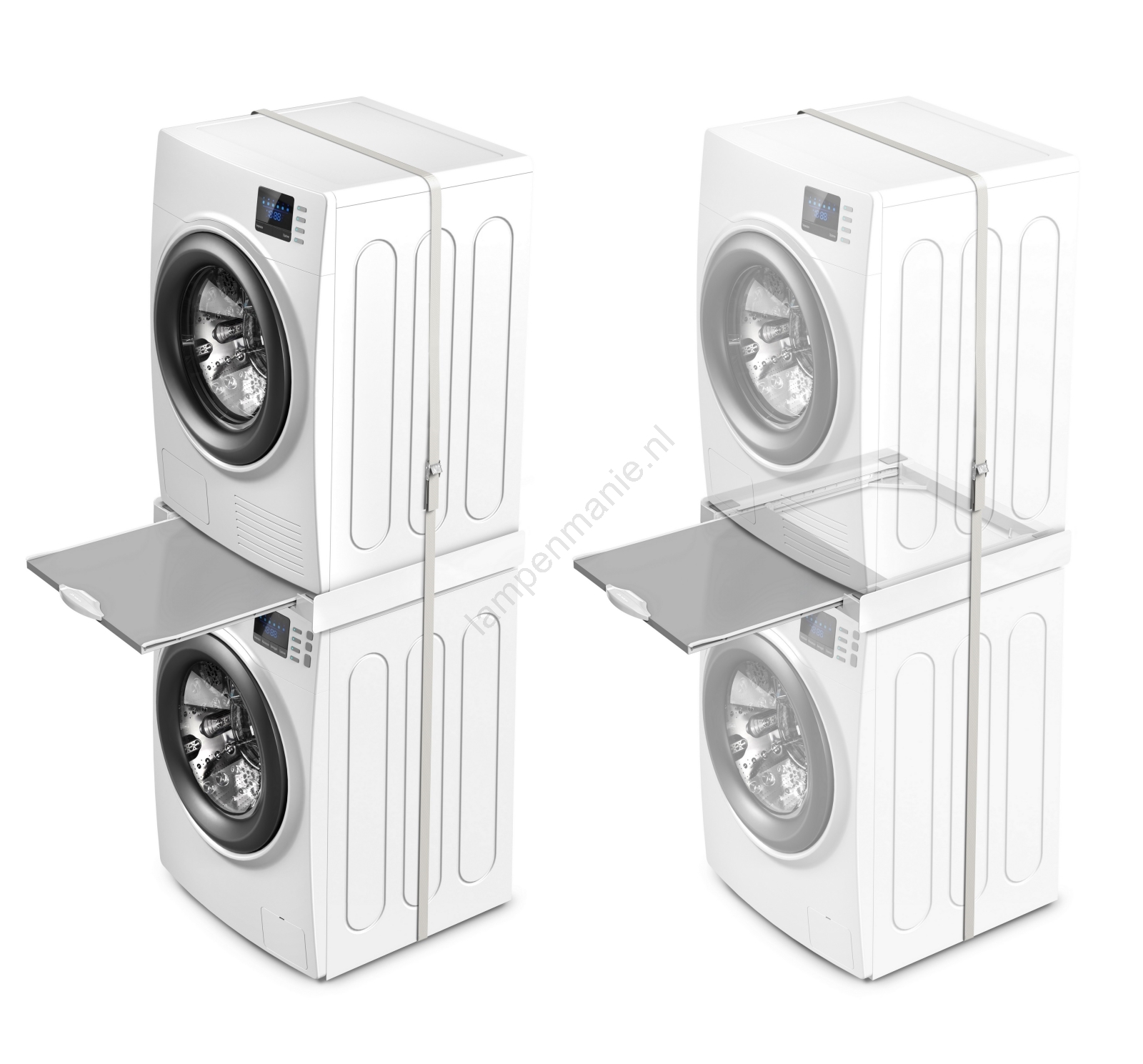 • Het tussenstuk is ontworpen voor het veilig stapelen van wasmachine en droger, waarmee u aanzienlijk ruimte bespaart in huis.