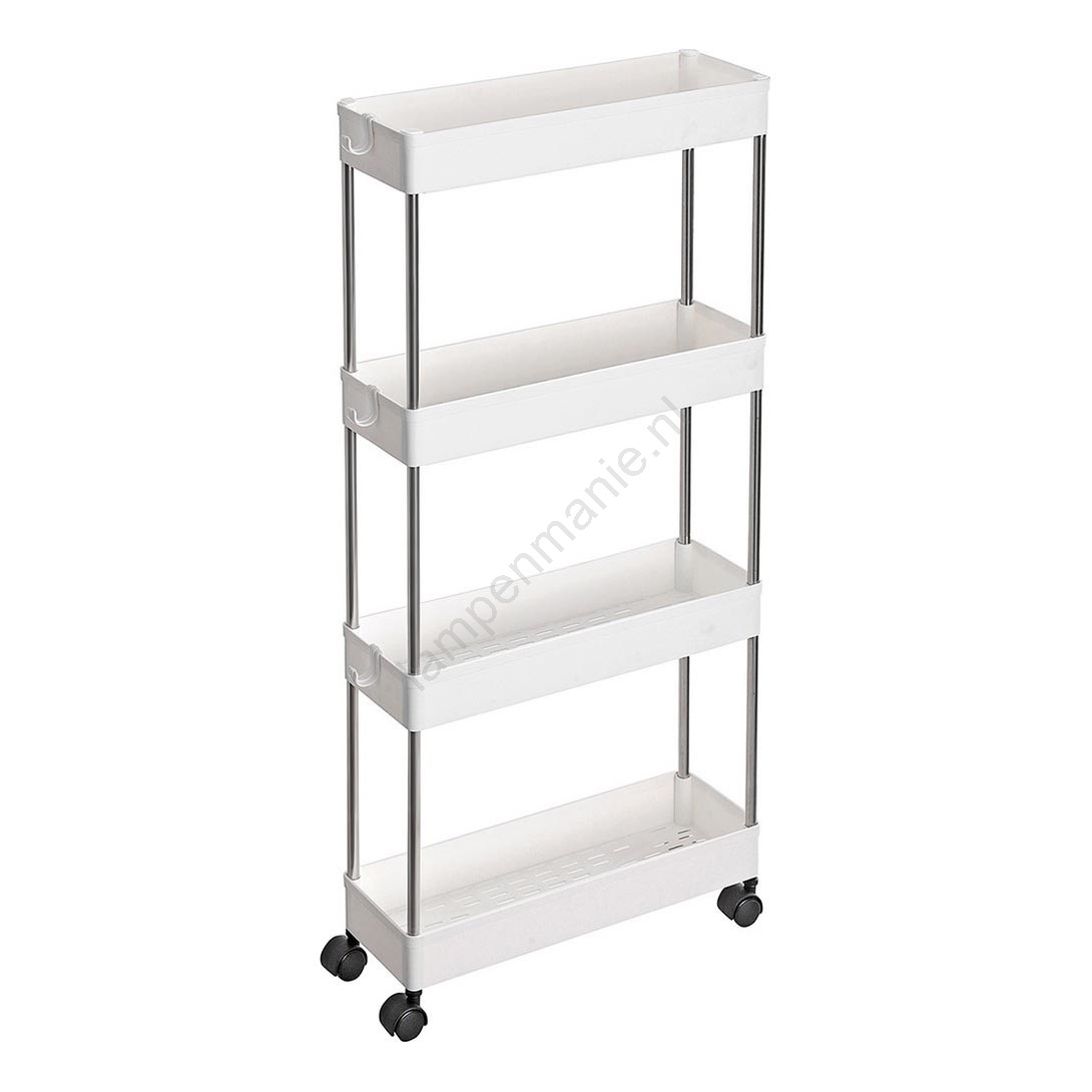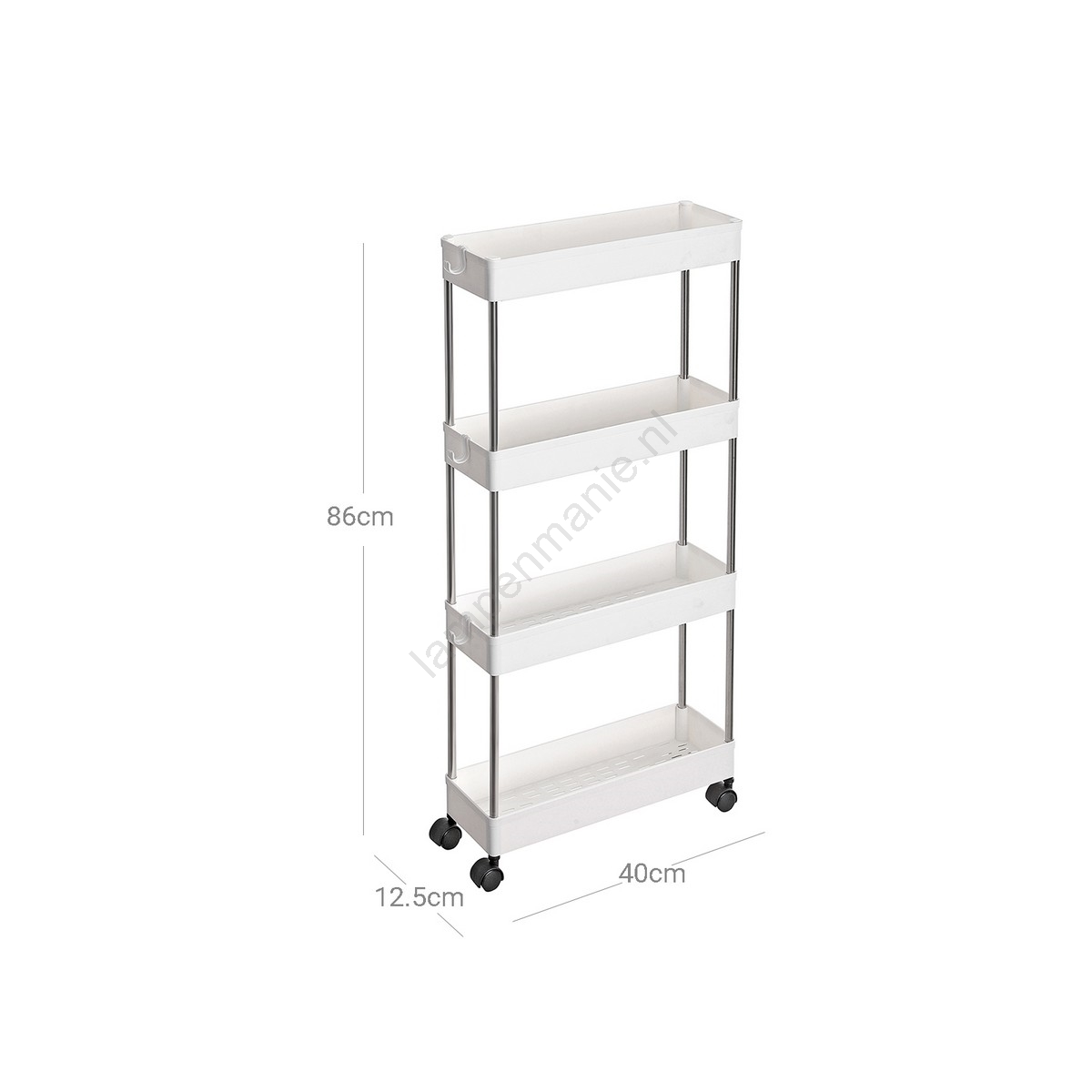 • Deze trolley past in krappe ruimtes in de keuken, badkamer, slaapkamer of wasruimte en helpt u uw ruimte zo efficiënt mogelijk te benutten.