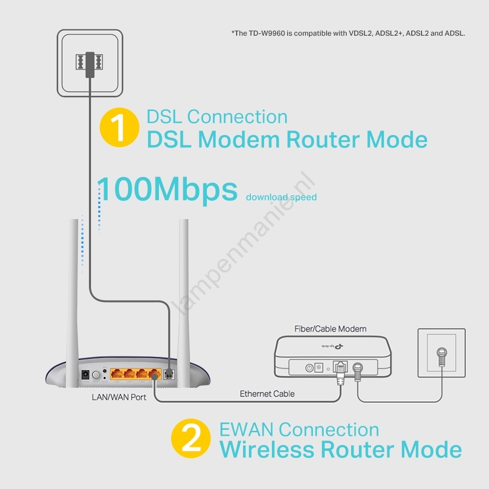 • Is compatibel met de standaarden VDSL2, ADSL2+, ADSL2 en ADSL, zodat hij werkt met de meeste DSL-netwerken van internetaanbieders.
