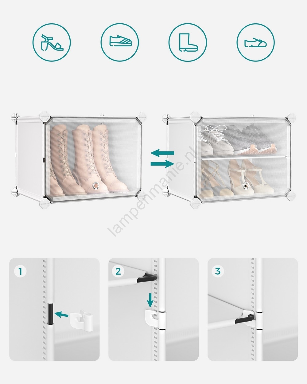 • De opbergmodule biedt plaats aan maximaal 32 paar schoenen; kan ook gebruikt worden voor het opbergen van tassen en kleding.