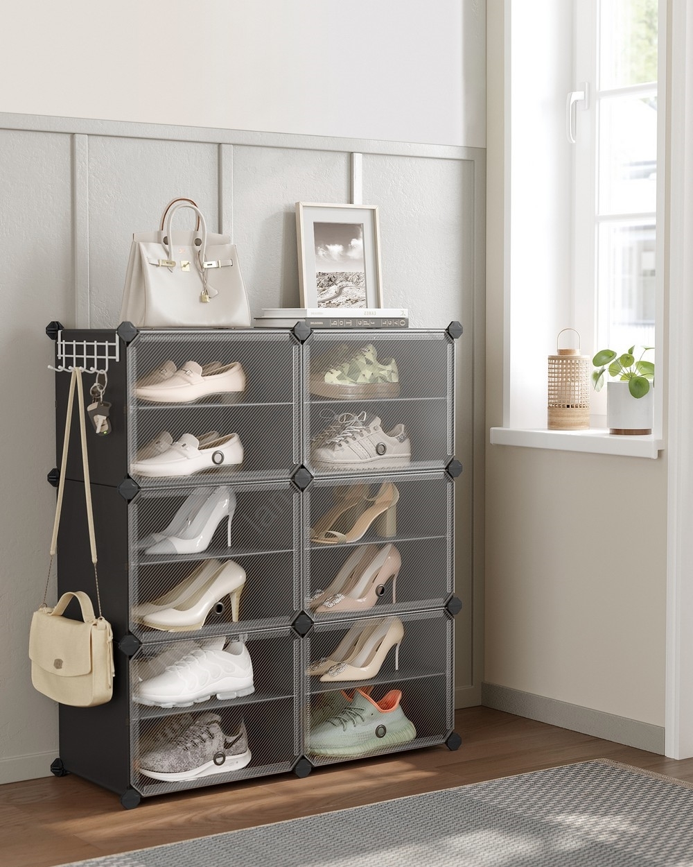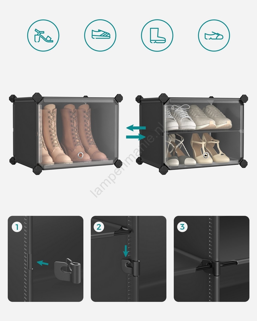 • Elke sectie van deze schoenenkast is gemaakt van hoogwaardige verbindingsstukken, kunststofpanelen en robuuste stalen draad en is belastbaar tot 5 kg.