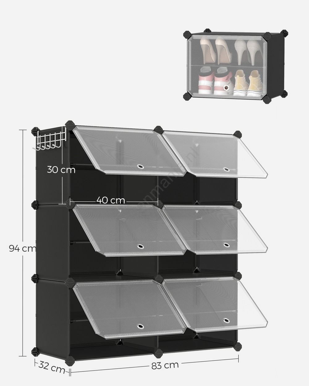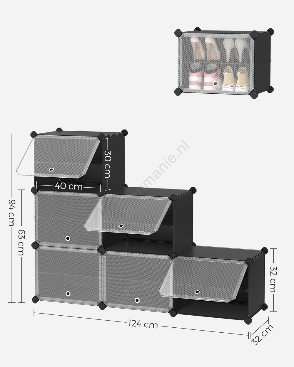 • Kan gestapeld en aan uw ruimte en voorkeuren aangepast worden, waardoor u elke centimeter van uw hal optimaal benut.
