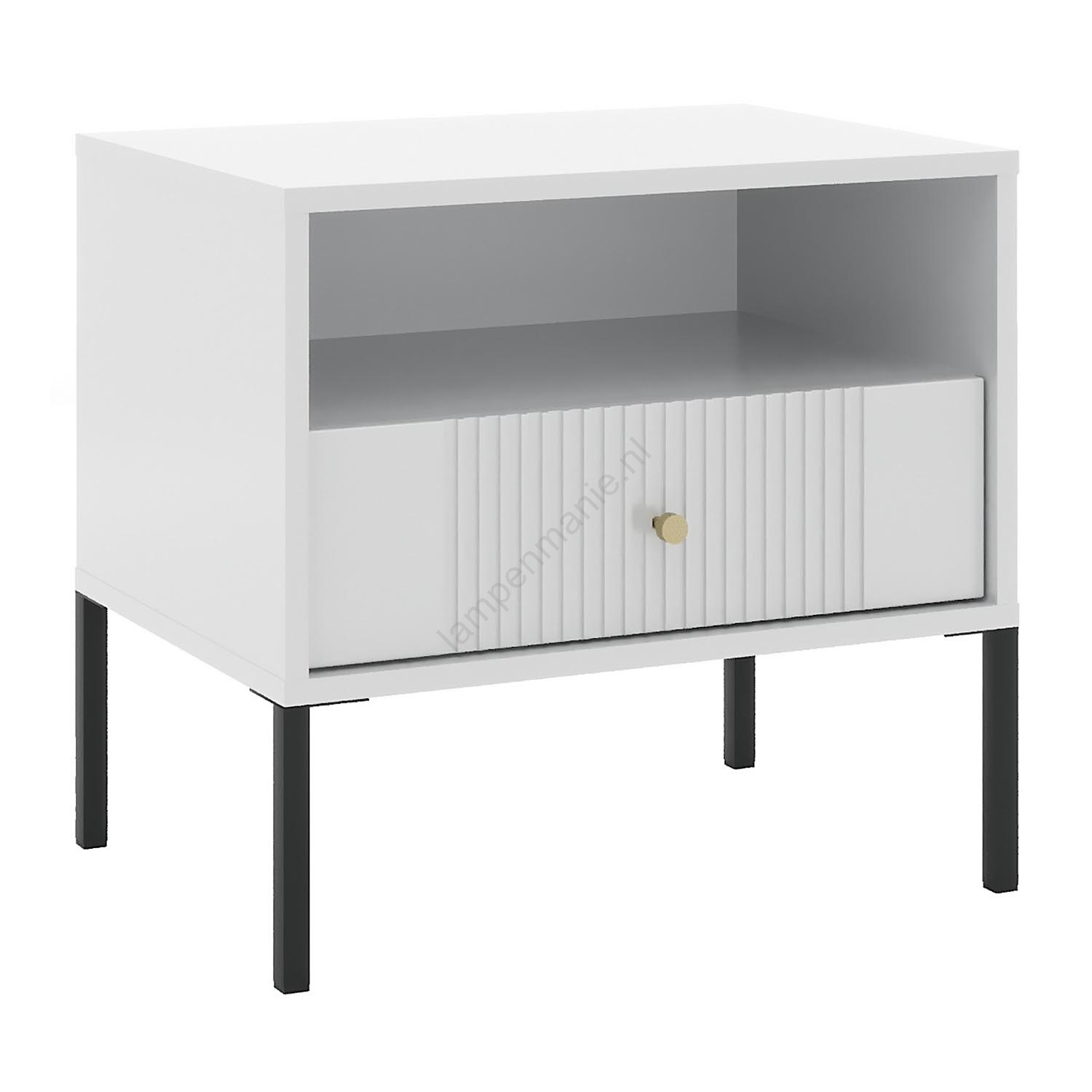 • Voorzien van één open plank en één lade, afgewerkt met verticale ribben voor een verfijnd visueel effect.