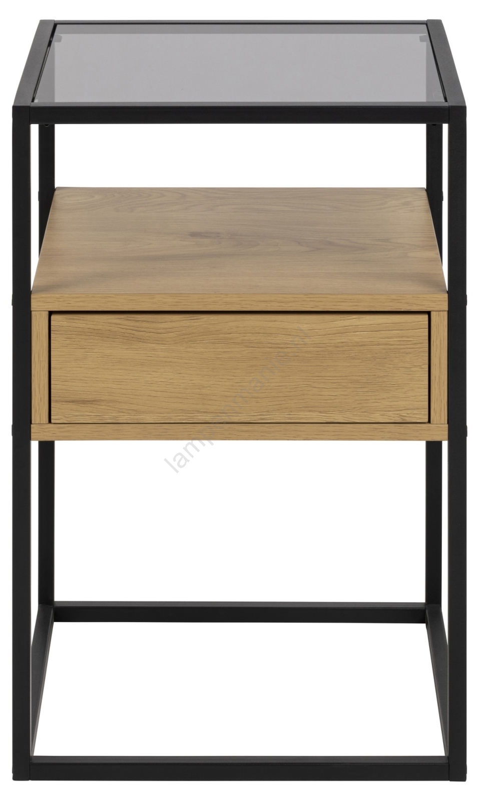 • Bovenkant van rookglas, frame, lade en plank van mat ruw craft melamine, onderstel van mat zwart ruw gepoedercoat staal.