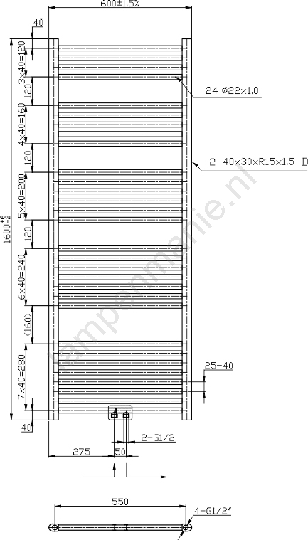 Novaservis - Badkamerradiator (laddermodel) 544W/230V 160x60 cm glanzend chroom recht