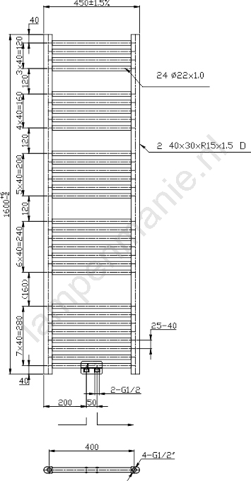 Novaservis - Handdoekradiator (laddermodel) 423W/230V 160x45 cm glanzend chroom recht