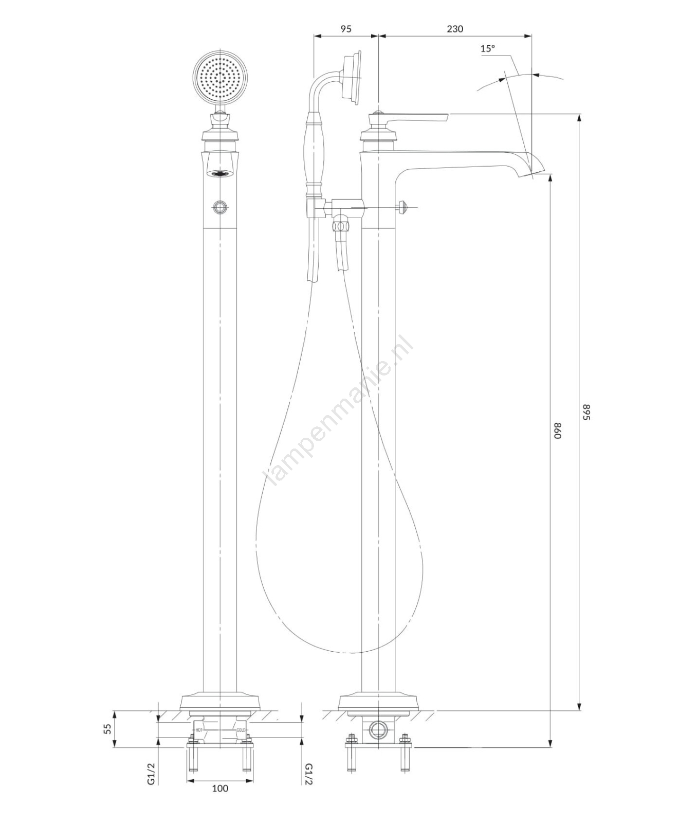 • Set bevat: messing kraan, messing handdouche (1 functie), messing doucheslang (150 cm), messing handdouchehouder met beschermende inzet.