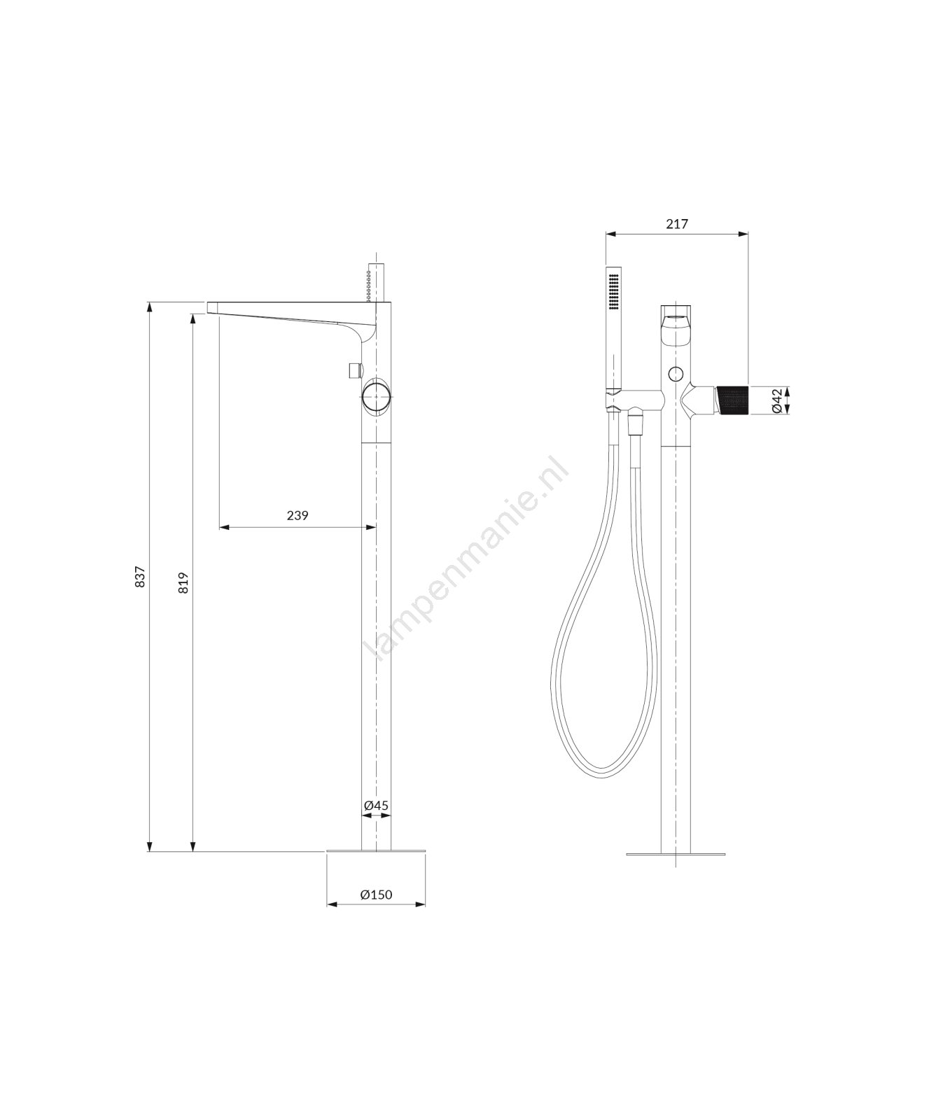 • Set bevat: messing badkraan, messing handdouche (1 functie), roestvrijstalen doucheslang (150 cm), messing houder voor handdouche met beschermende inzet.