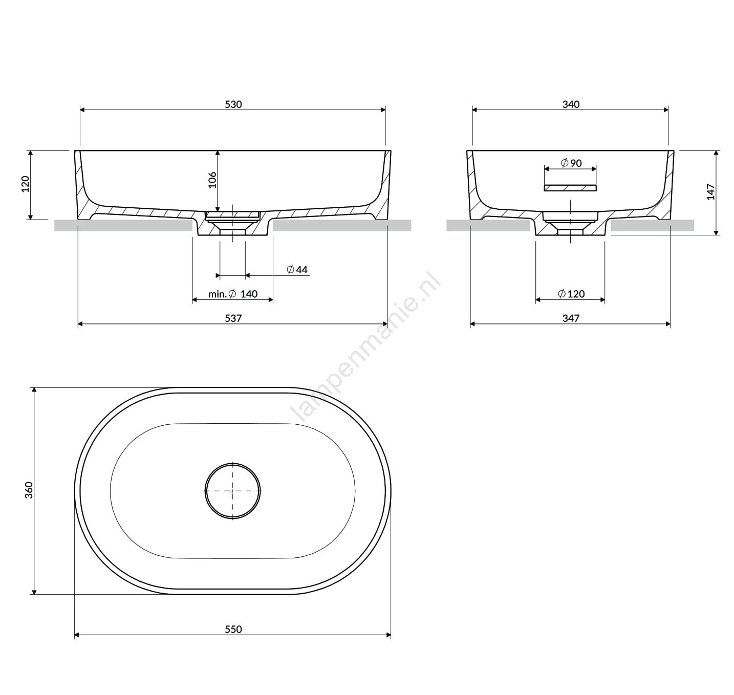 • De wastafel is bedoeld voor plaatsing op een blad, wat flexibele plaatsing en combinatie met verschillende soorten badkamerbladen mogelijk maakt.