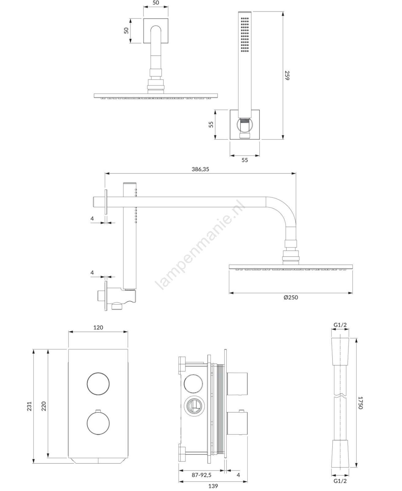 • Set bevat: messing thermostatische kraan, messing douchekop, messing handdouche, roestvrijstalen doucheslang, messing douchearm, messing douchebocht met houder voor handdouche.