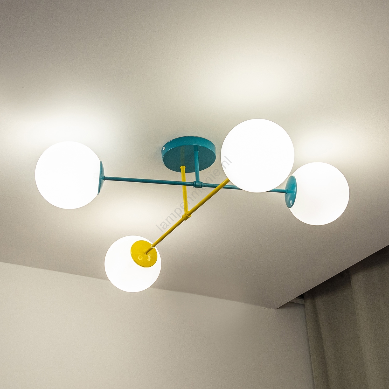 Opbouwkroonluchter MOON 4xE27/15W/230V turkoois/geel kenmerkt een mooi en functioneel ontwerp.  Voor het licht is een lamp met E27 fitting geschikt. Hier kunt u andere lampen tegen voordelige prijzen kopen. U heeft een interessante aanwinst voor uw woning.