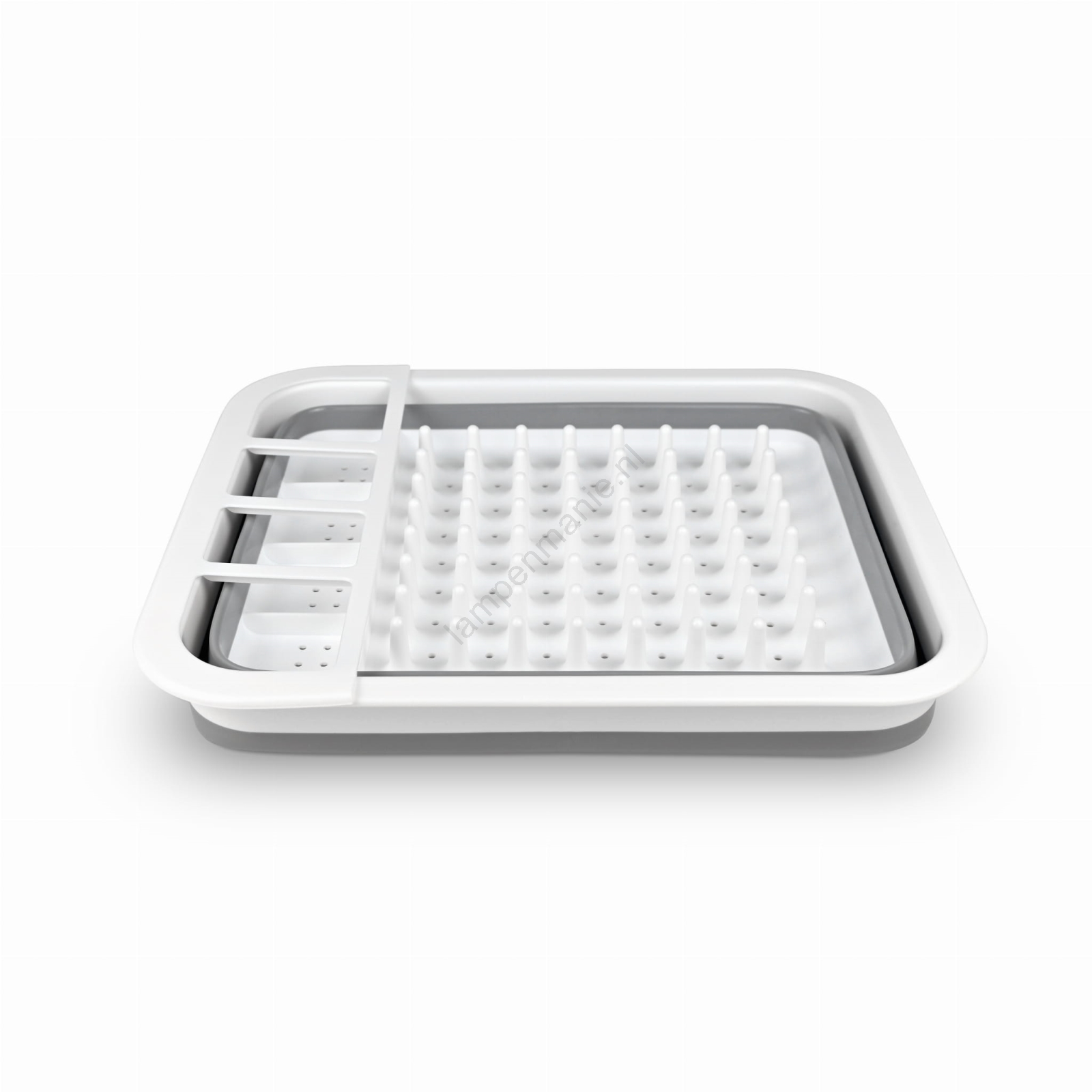 • Het opvouwbare siliconen afdruiprek is een praktische hulp voor het drogen van servies, glazen en bestek — ideaal voor kleinere keukens, appartementen, campers of een vakantiehuis.