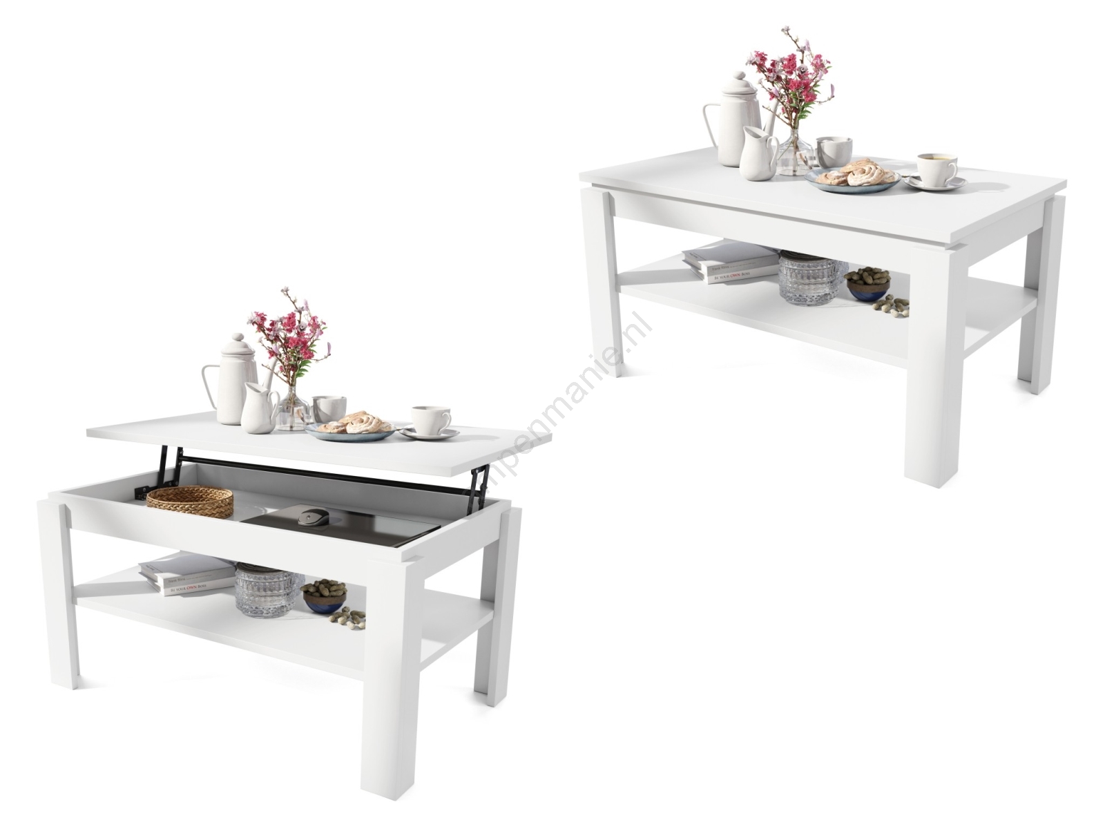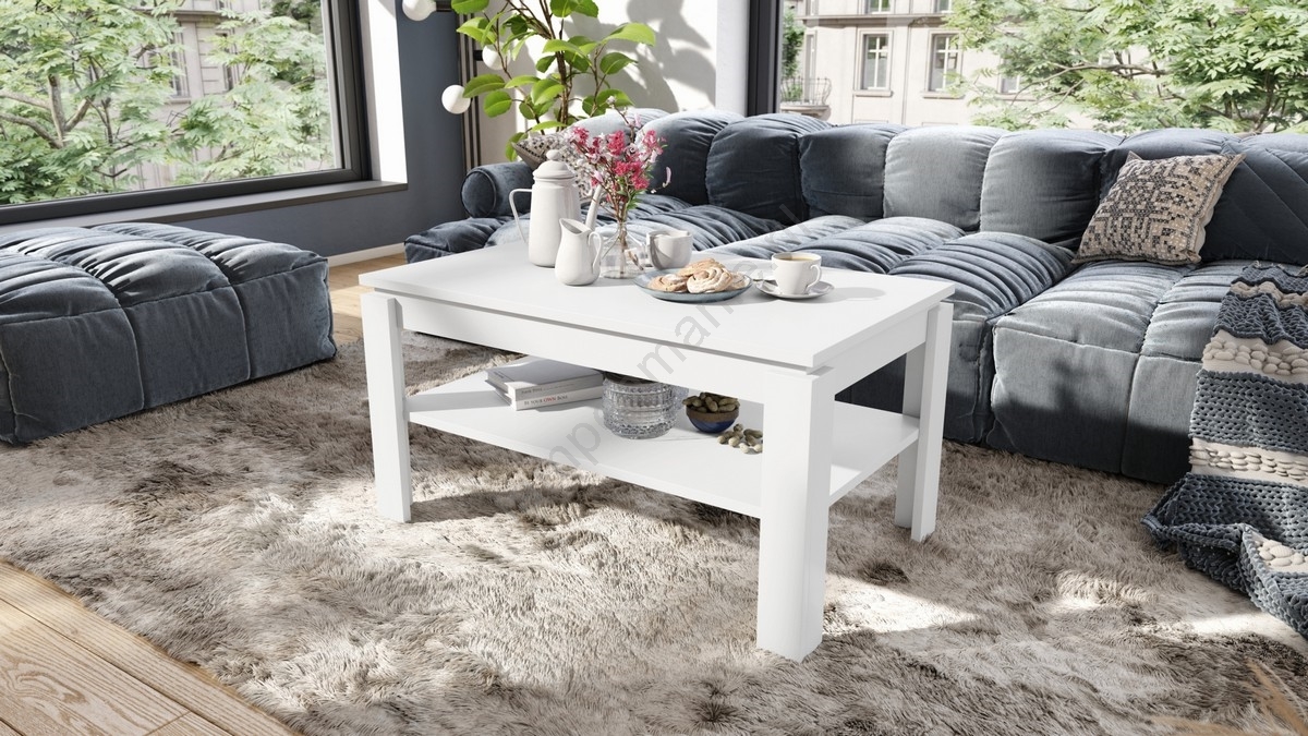 • Uitschuifbare salontafel met liftend tafelblad en plank ADEN wit