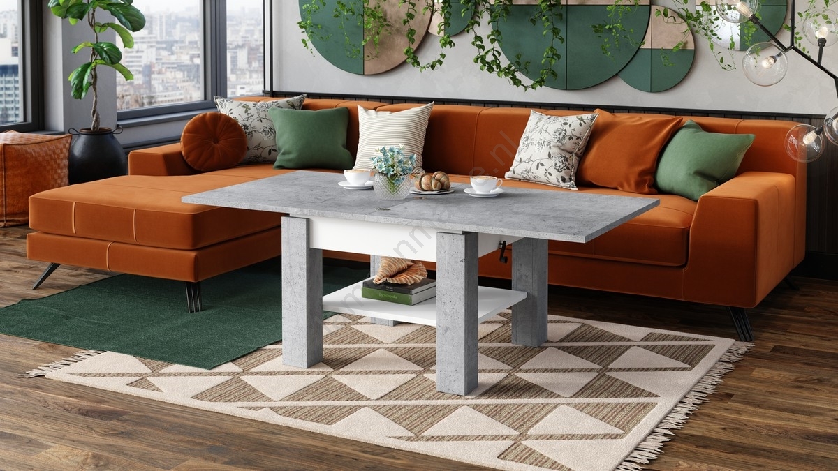 • Uitschuifbare salontafel/eettafel met hefblad CALEB betongrijs/wit
