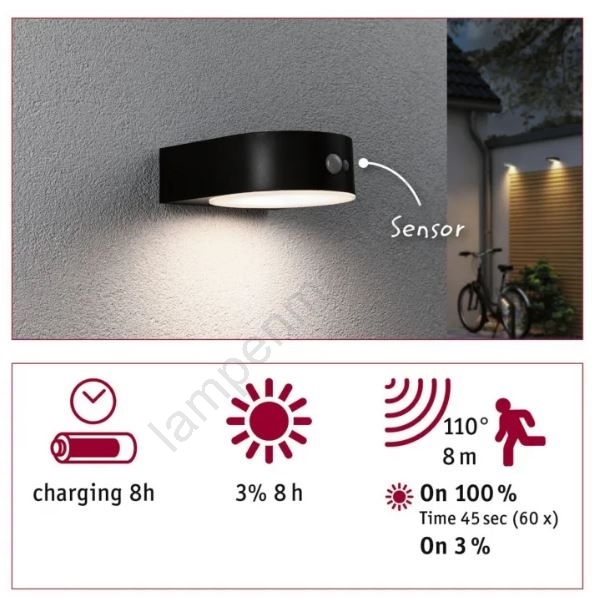 Paulmann 94570 - LED/5,5W IP44 Solar wandlamp met sensor EILEEN 3,7V 2000 mAh
