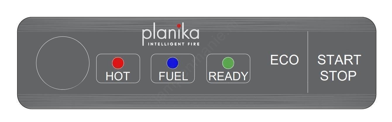 • Bedieningspaneel maakt handmatige in- en uitschakeling van de haard mogelijk, schakelen naar ECO-modus en geeft tegelijkertijd aan wanneer de brandstoftank leeg is, wanneer de haard klaar is om in te schakelen en wanneer deze oververhit is.