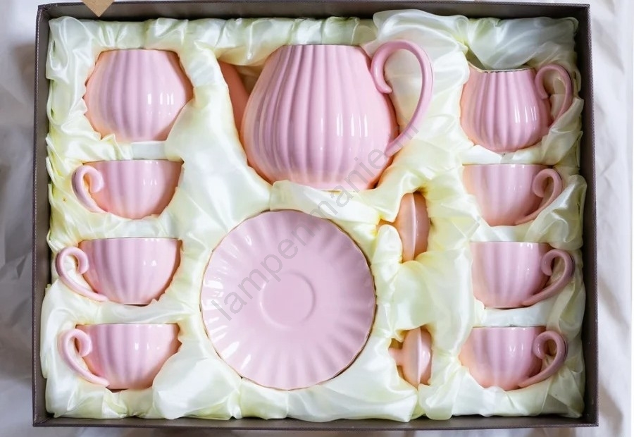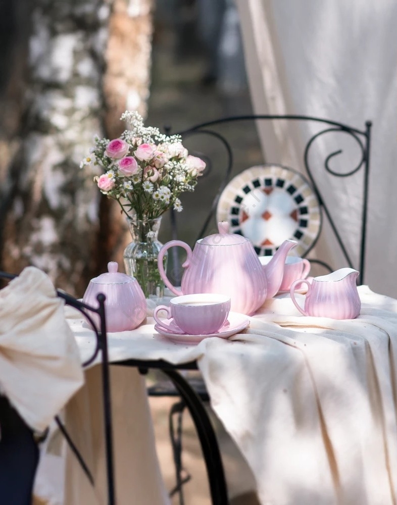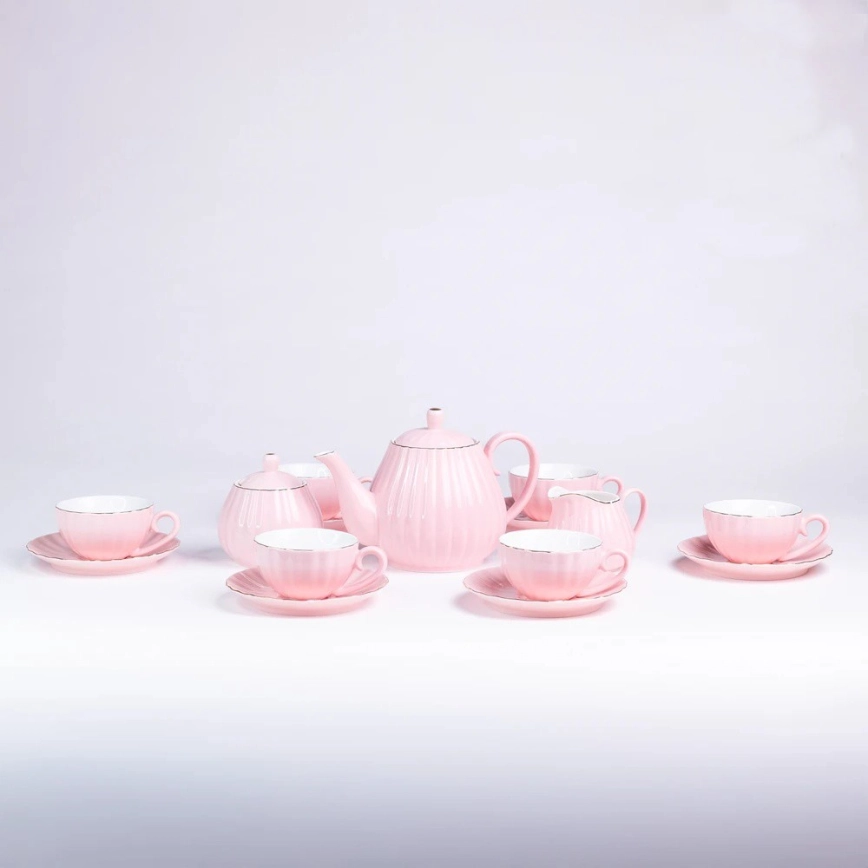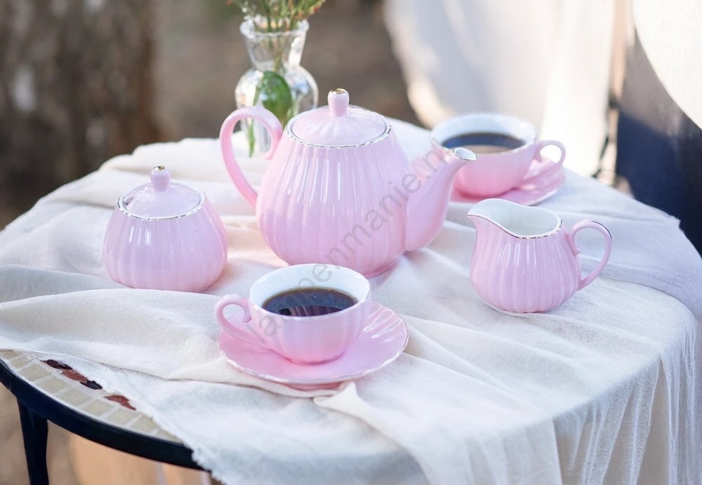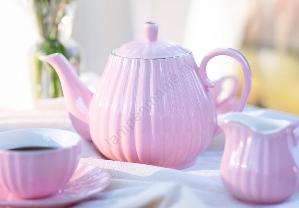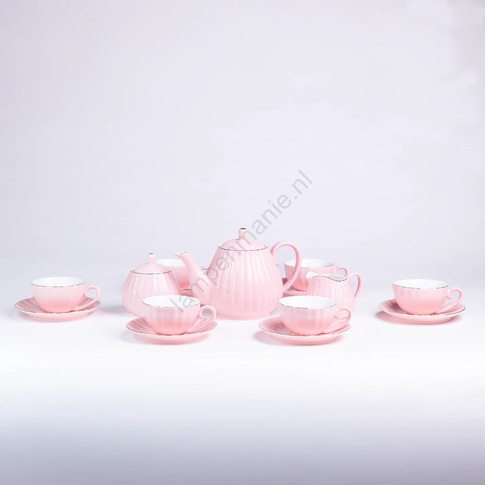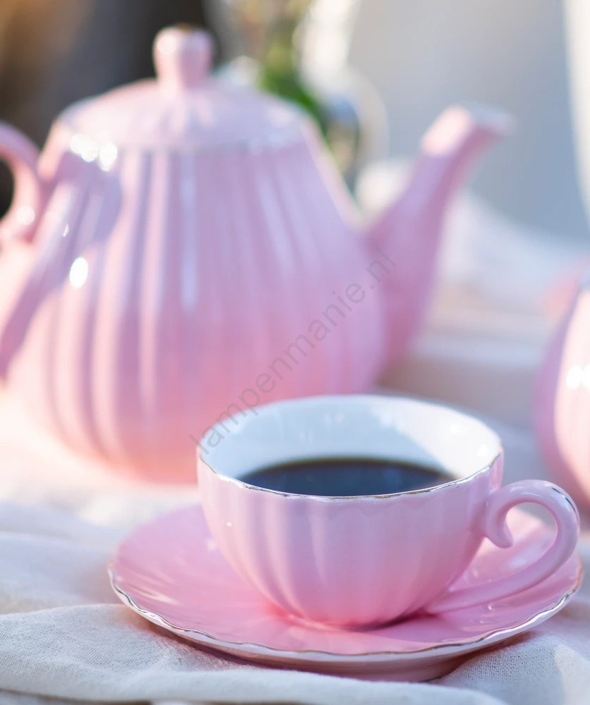 • Tijdloze set porseleinen servies in een elegante roze kleur.