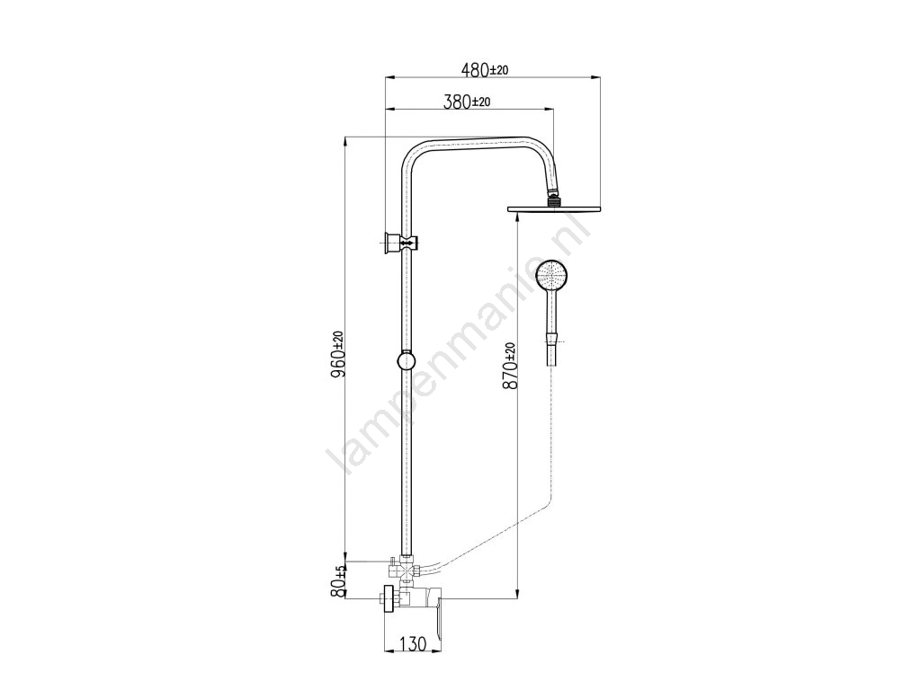 • Set bevat: douchemengkraan, kunststof handdouche (Ø 103 mm), kunststof hoofddouche (Ø 230 mm), kunststof doucheslang (1500 mm), douchestang.