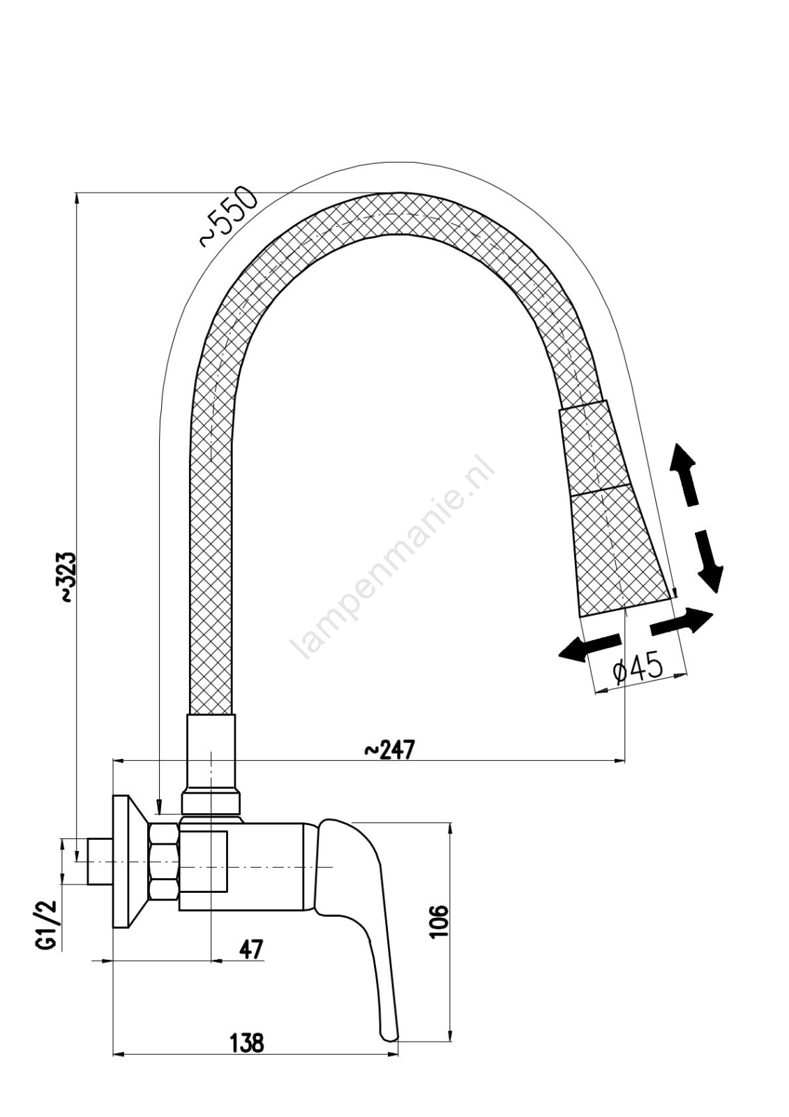 • Wandkraan voor de spoelbak met flexibele, draaibare uitloop en sproeikop.