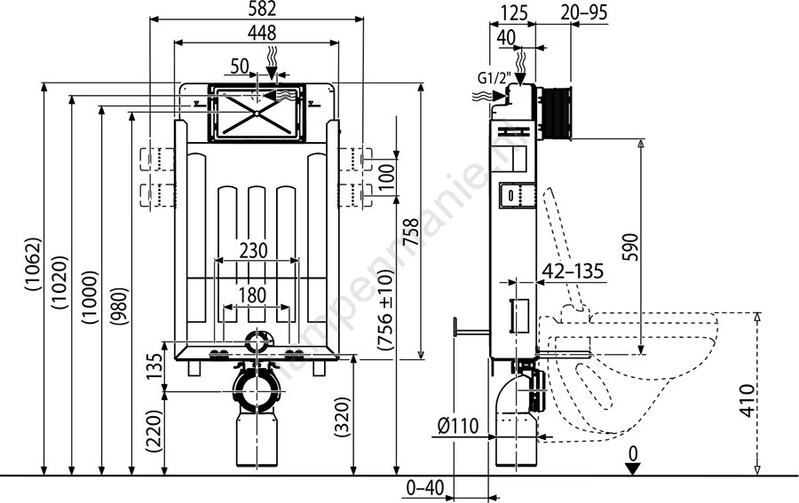 • Basismodule voor een hangend toilet met aansluitafstand 180 of 230 mm, bedoeld om in te bouwen en af te werken.