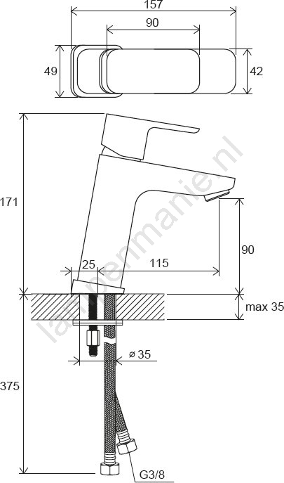 • De kraan wordt geleverd zonder waste en bevat flexibele aansluitslangen van 400 mm met een diameter G3/8.