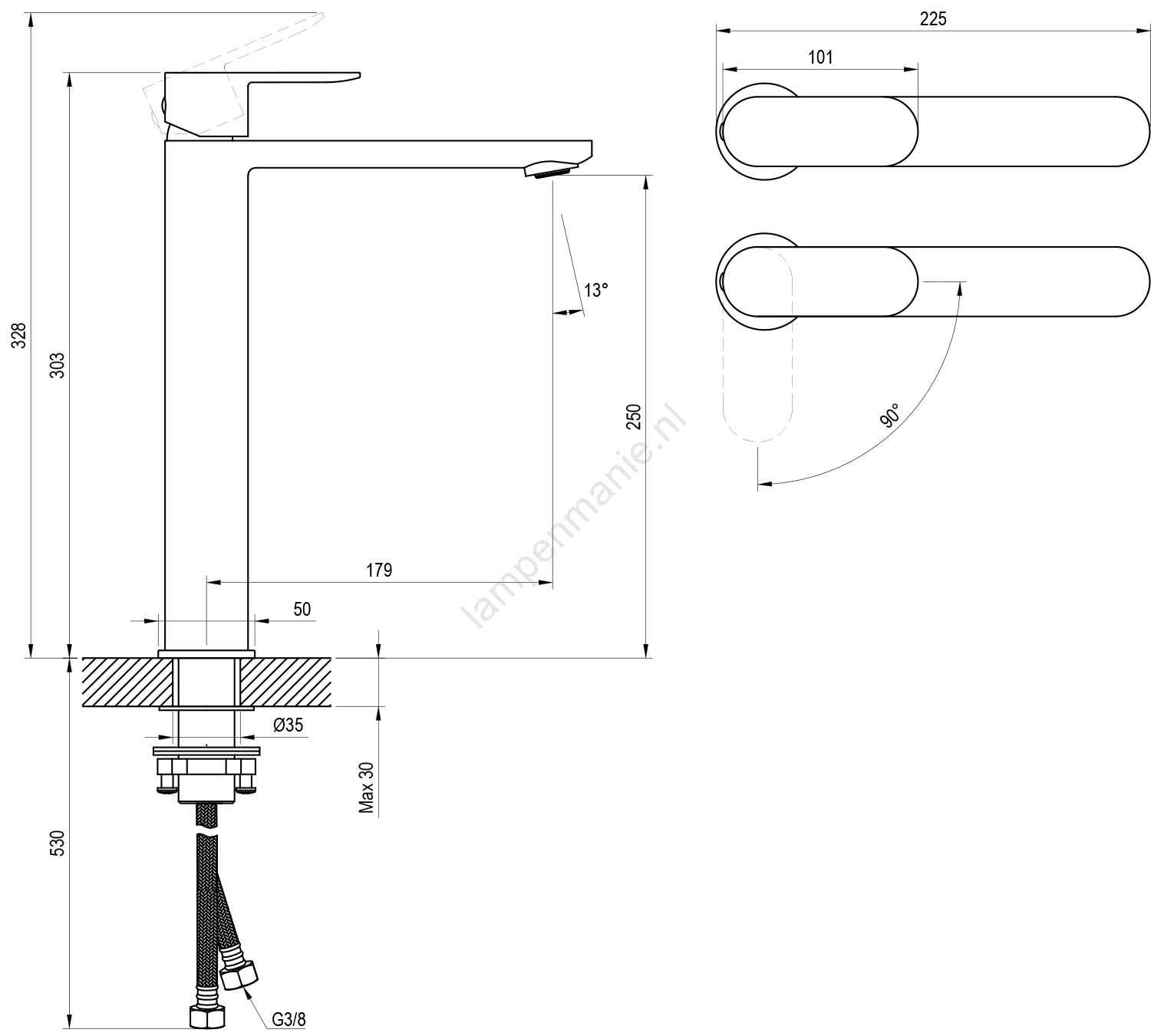 • De kraan wordt geleverd zonder waste en bevat flexibele aansluitslangen van 450 mm lengte, diameter G3/8.