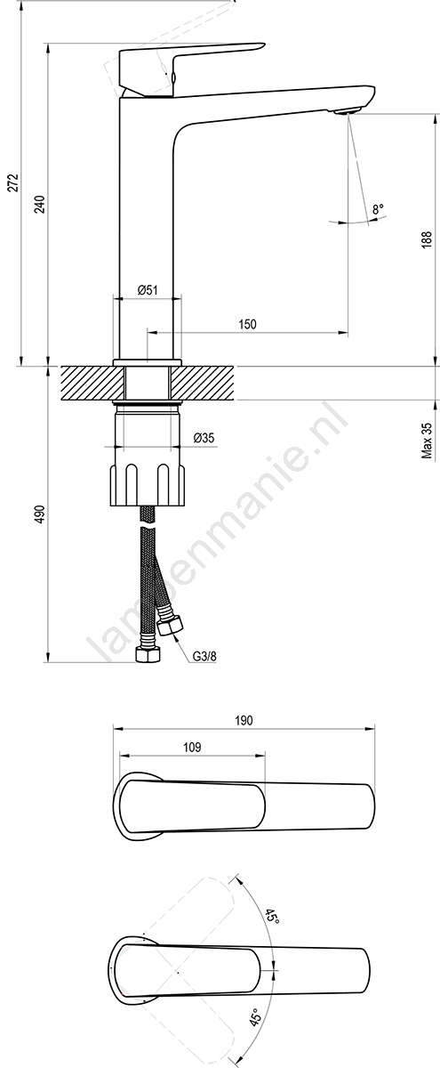 • De kraan wordt geleverd zonder afvoer en bevat flexibele aansluitslangen van 450 mm met aansluiting G3/8.