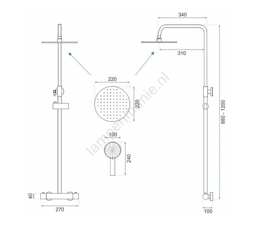 • Verpakking bevat: thermostatische kraan, hand- en hoofddouche, douchehouder, 150 cm slang.