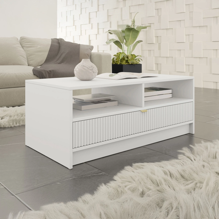 • Salontafel met een praktische lade en een open plank om spullen die u binnen handbereik wilt hebben op te bergen.