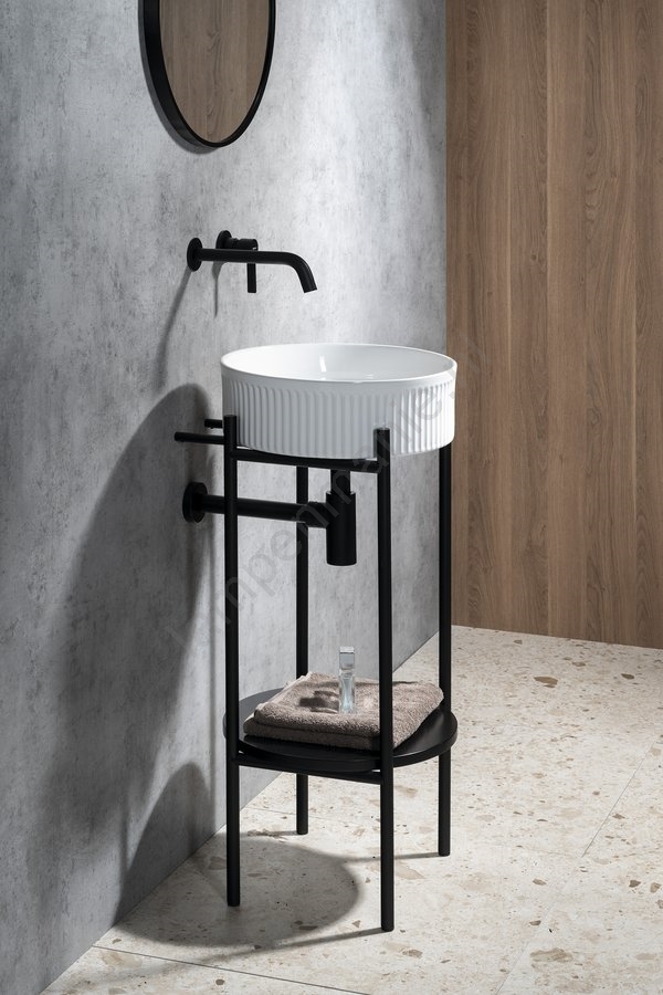 • Keramische opzetwastafel voor op het werkblad met een diameter van 370 mm.