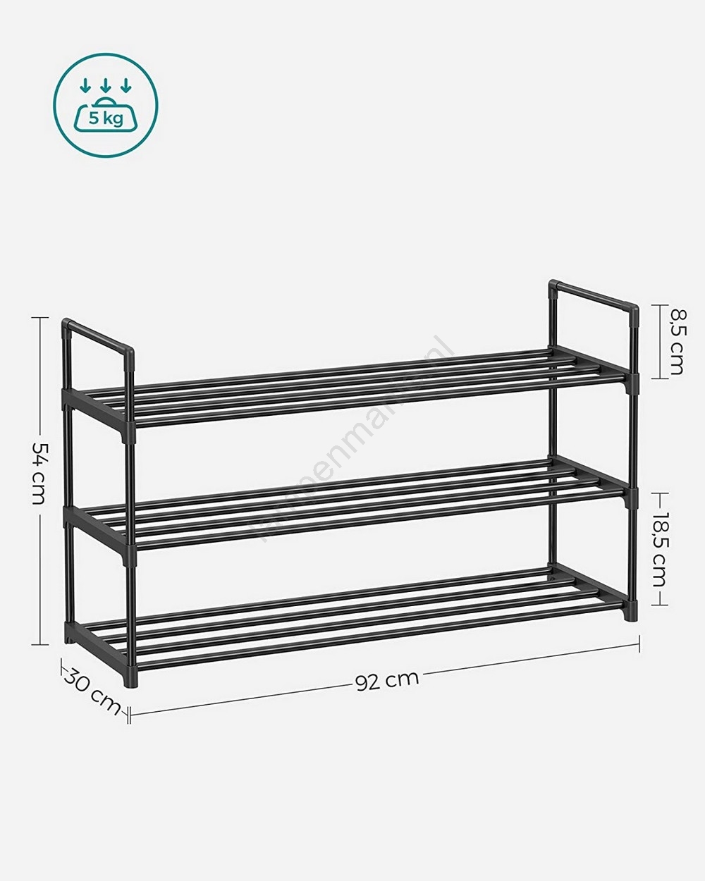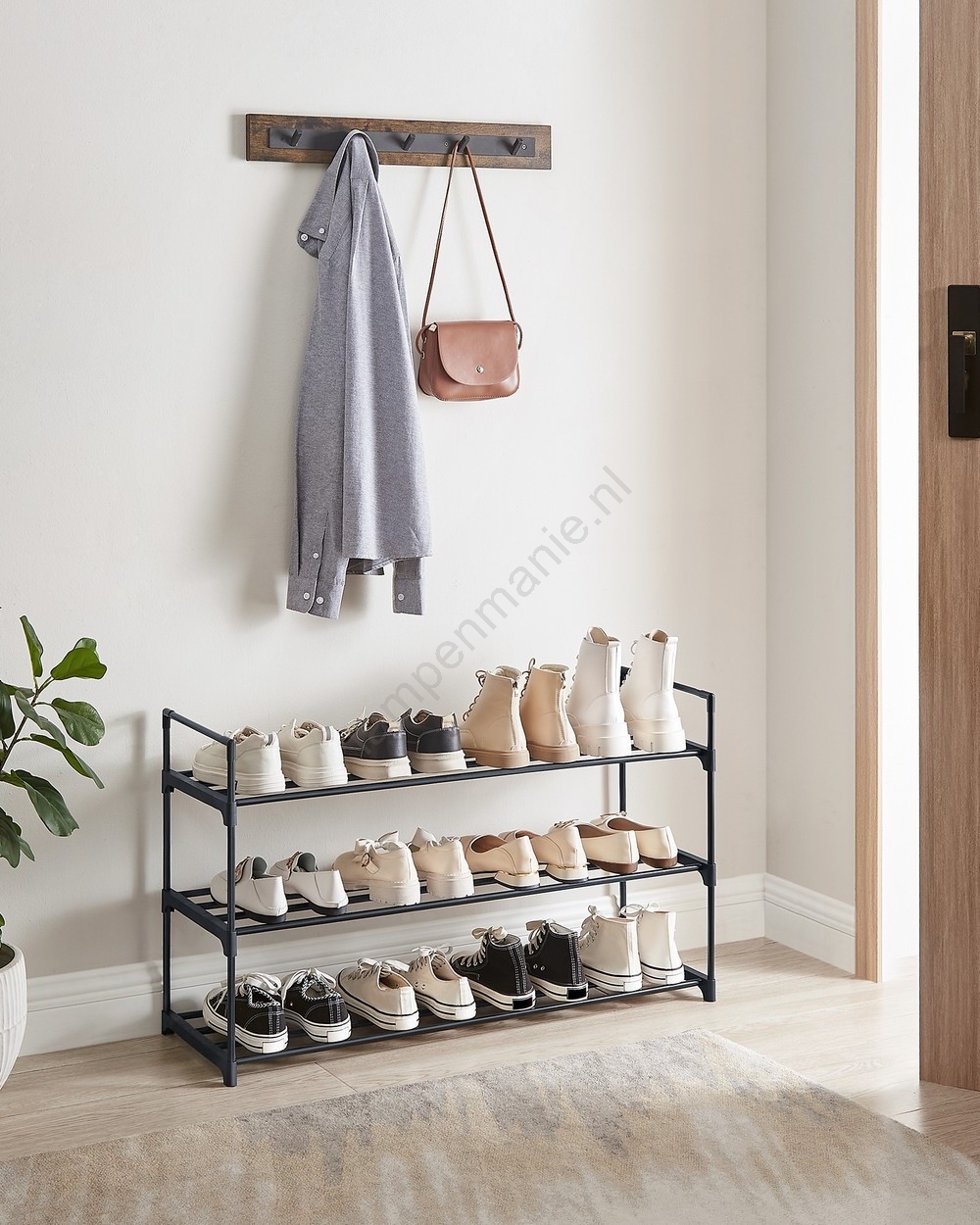 • Dankzij het slanke profiel neemt dit 3-laags schoenenrek weinig vloeroppervlak in beslag en biedt het toch voldoende opbergruimte voor 12 paar schoenen.