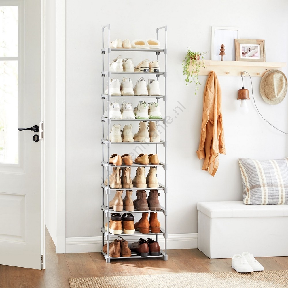 • Door zijn slanke vorm neemt deze 10-laagse schoenenkast weinig vloeroppervlak in beslag en biedt hij toch voldoende bergruimte voor 20 paar schoenen.